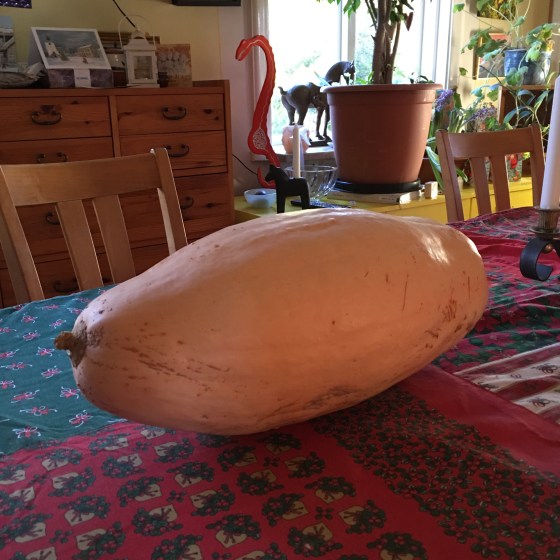 Här ligger julskinkan, eller är det en ”kalkon”? Nja, en helt naturlig Pink Banana pumpa som ska transformerad till det kommande julbordet. Stor är den. Men det är ju lite det som e grejen.