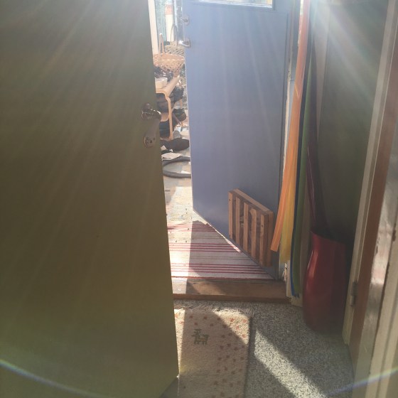Köksdörrens dubbla dörrar har varit stängda hela vintern. Det drar lätt kallt annars. Nu öppnar vi… och IN KOMMER SOLEN!!
