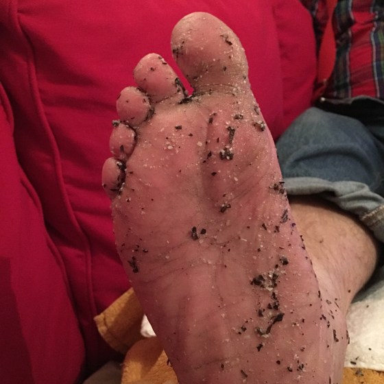 Efter den stillsamma fotmassagen smörjer på vi lite extra ricinsmör på fötterna. Det här var förvånande lättgjort och vi planerar genast en utökad plantering av ricin i årets trädgårdsland.