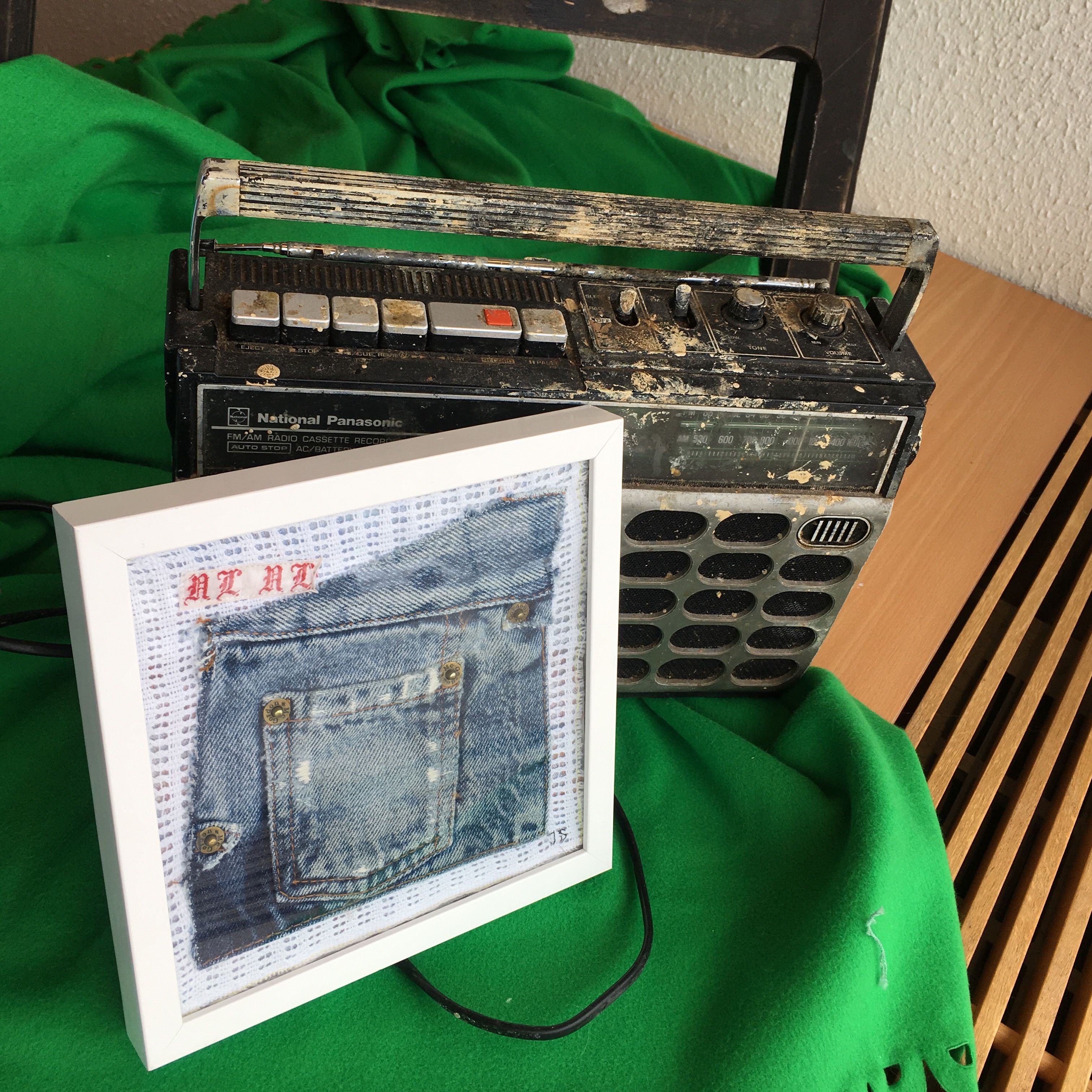 Gröna o gula textilier och grejer som ger ateljé känsla.