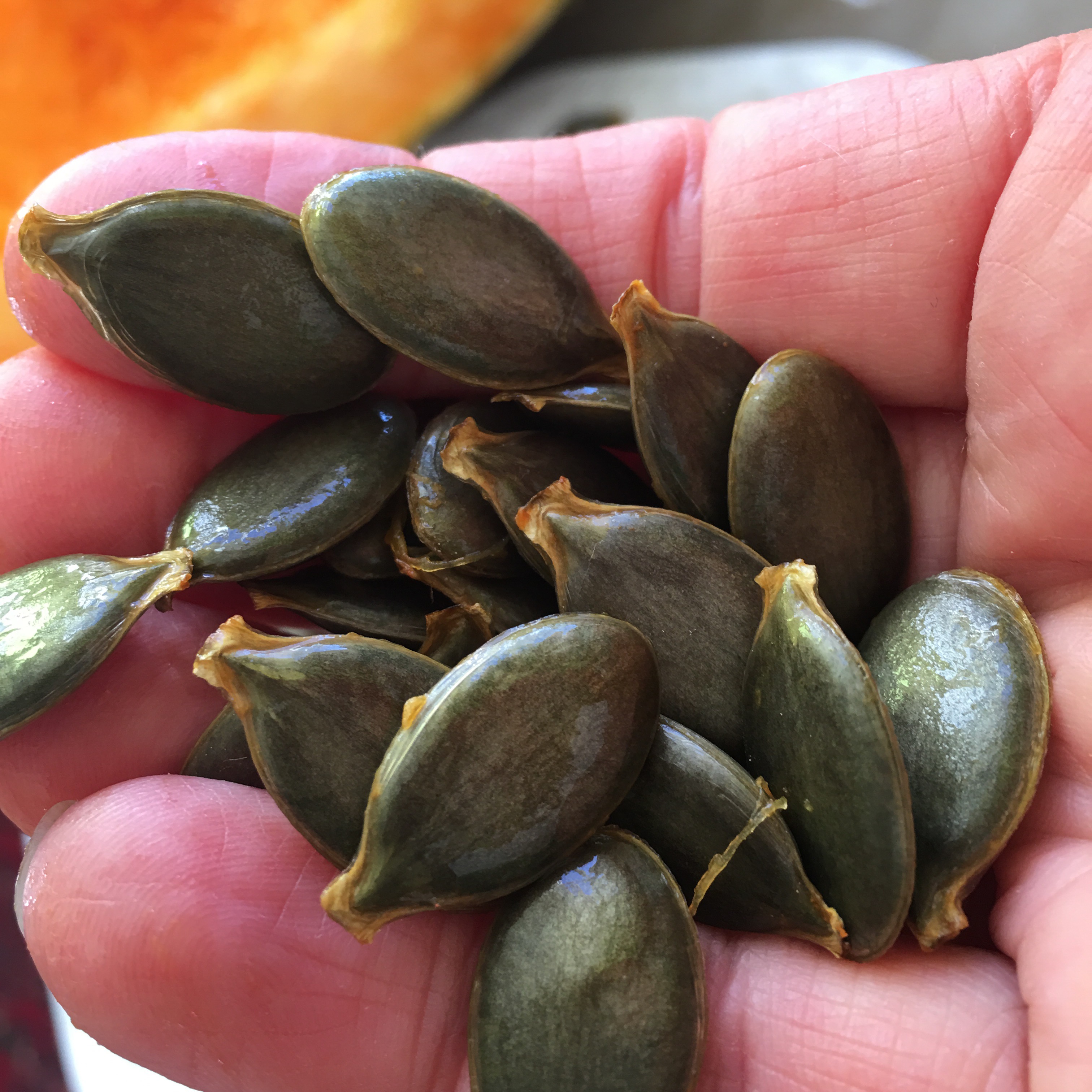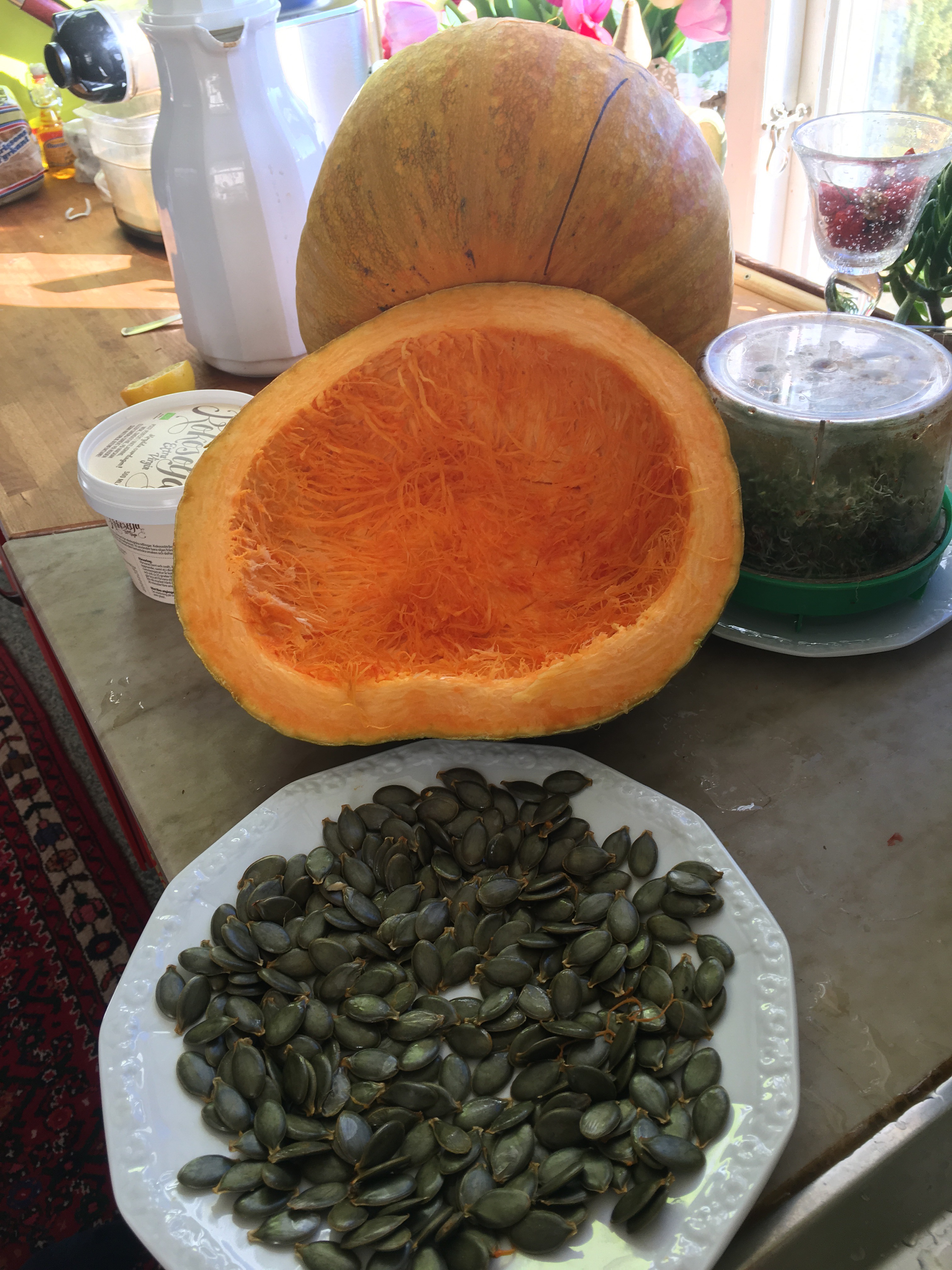 Fröna i den här pumpan är utan det hårda skal som vanligtvis finns på pumpafrön, de är nakna. Gröna, stora, färska är det ofattbart goda. Ganga försöker behärska sig och inte äta upp alla rakt av. Det går sådär.
