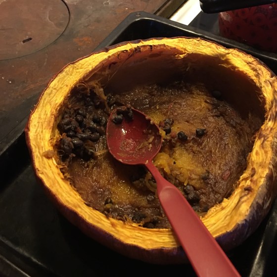 Det blev en fortsättning på nakenpumpan. Man odlar den för fröna och den är inte speciellt tjock i köttet, men den blev till en alternativ ugnsform. En väldigt god böngryta där vi kunde skrapa lite extra pumpa från väggarna. Väldigt trevlig.