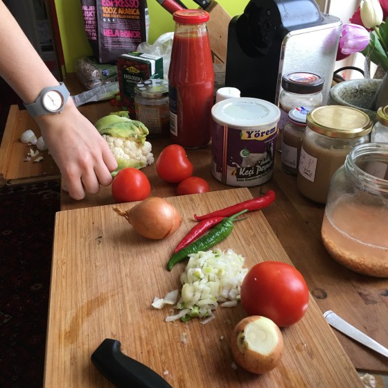 Allt bakar till sig i ugnen och vi får en rejäl snabblunch. Ritas matkonster har breddats av att bo med vänner från andra matkulturer. Uppskattat.