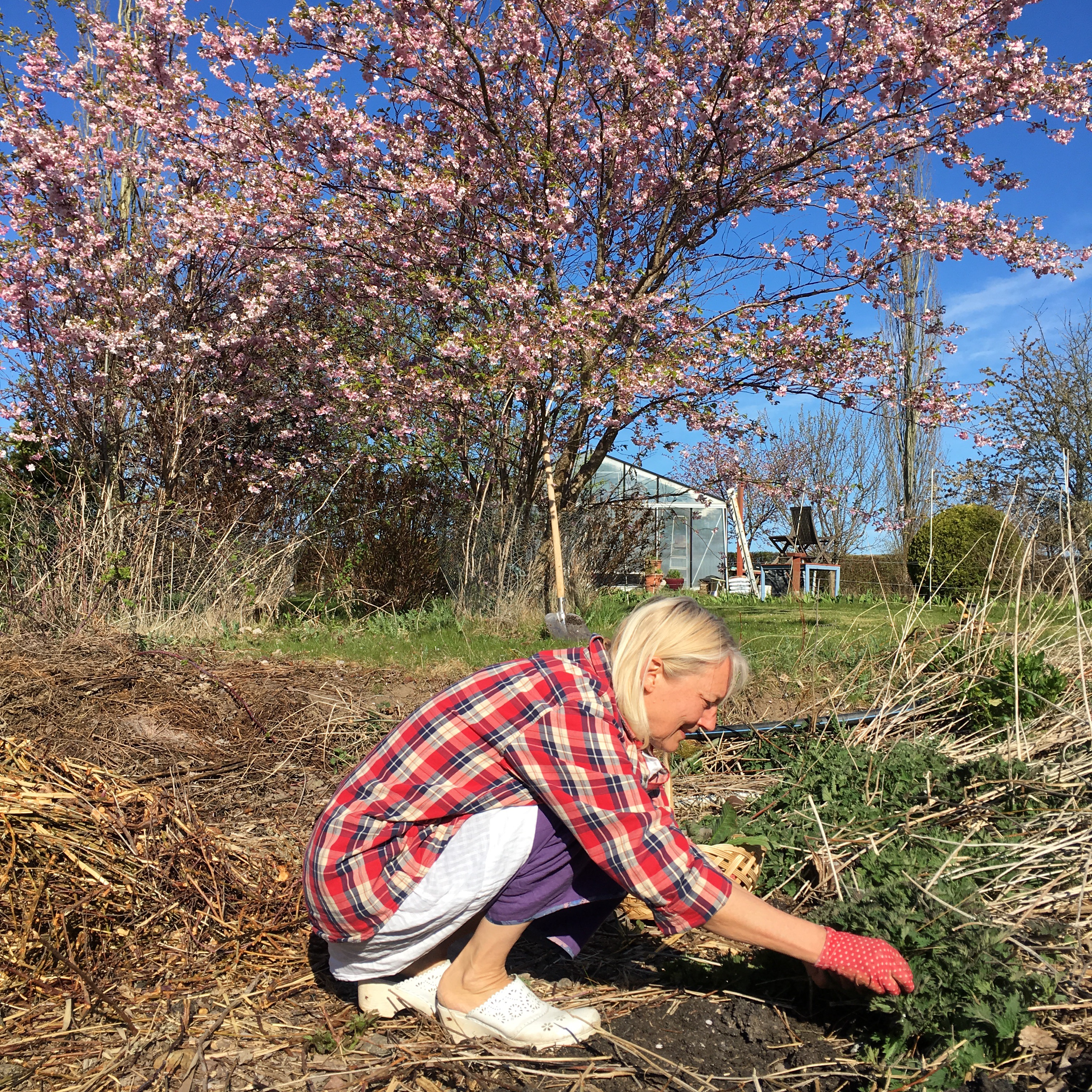 Så här ser man ut. Rumpan upp o huvudet ner. Från och med nu är plocka-säsongen igång. Nu är det gröna blad… de kommer ju att fortsätta ända till nästa snö. Men man vet, nu kommer än det ena än det andra att avlösa varandra i trädgården. Innan man ordet av, så plockar man smultron sen hallon o sen körsbär och med lite tur plockar vi vårmusseronet ( svampar) där emellan. Det gillar vi.