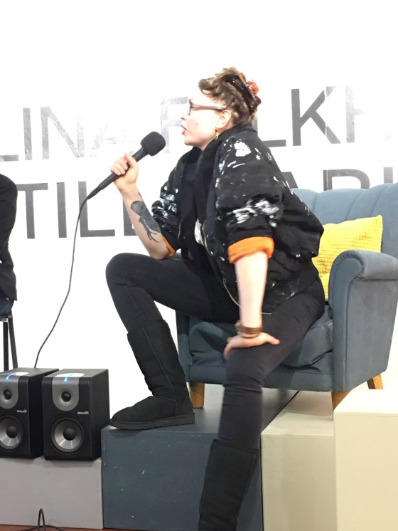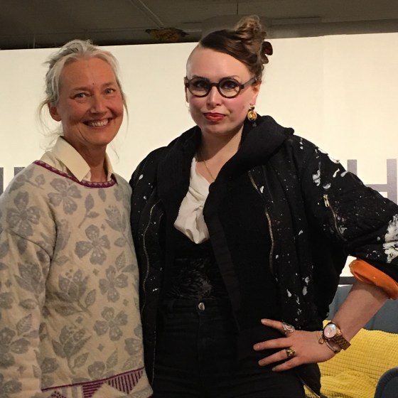 Hon berättar mycket: om sin arbetsprocess som ofta utgår ifrån ord, o gärna de där orden som vi knappt tillåter oss att uttala. Hon berättar om ”kroppsforskar” fascineras av människans förhållande till sin kropp, inte bara fittan ( som väl är det som hon är mest känd för, kanske) utan händer öron o allt möjligt.(utställningen heter Örat mot marken).