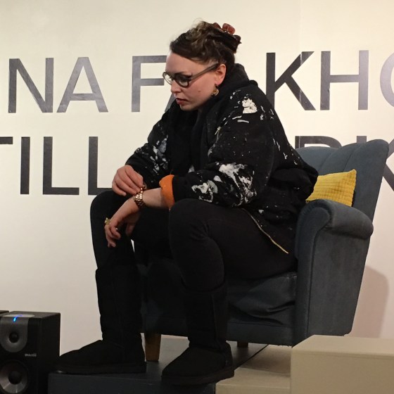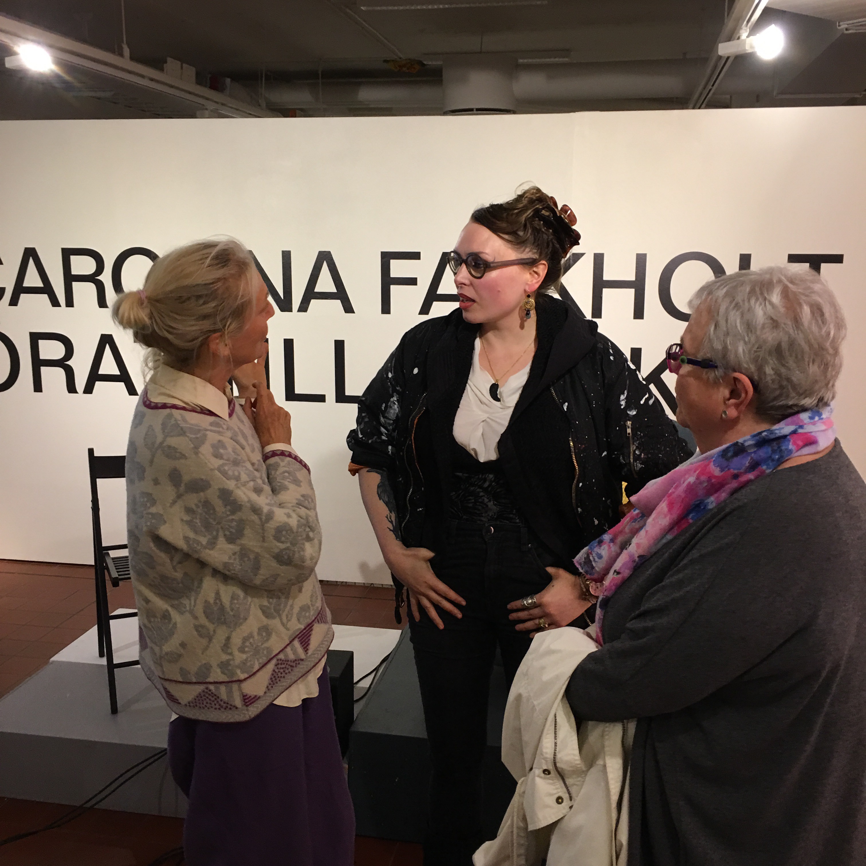 Vi är i Jönköping. På Österängens Konsthall är det Carolina Falkholt som både stället ut och graffittar en vägg. Men i kväll är det Artist Talk och vi är här. / I efterdyningarna på väggmålningen i Norrköpingsskolan delades Sverige i två delar, för och emot det skamlösa att måla fittor offentligt. Det var i den vågen som Ganga gick med i fittkonstgruppen i Stockholm och oj, va mycket roligt det har kommit ur det.