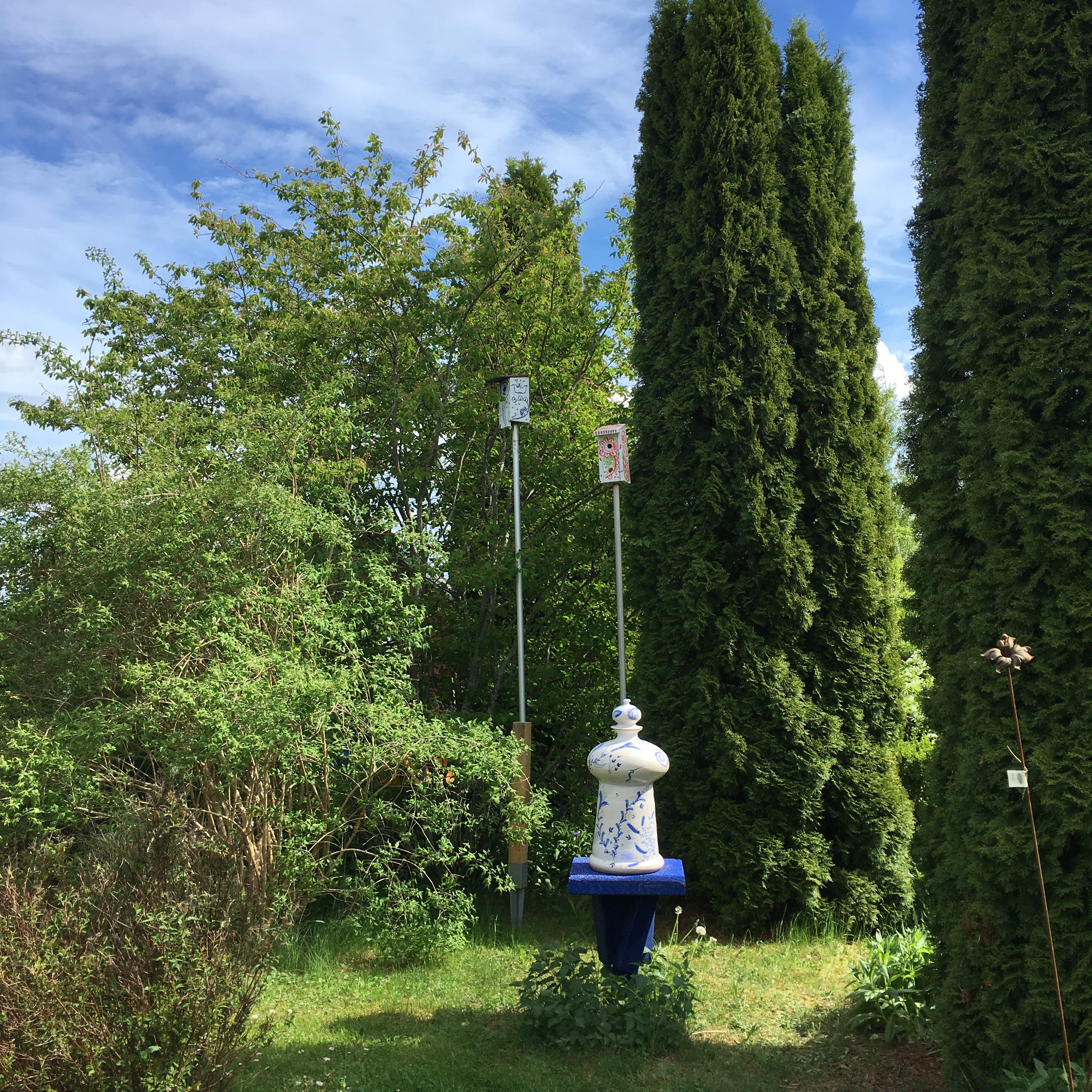 Våra fågelholkar snyggar sig med Lasse Frisk skulptur-den är visserligen varken gjord av oss eller till salu, men får vara med ändå.