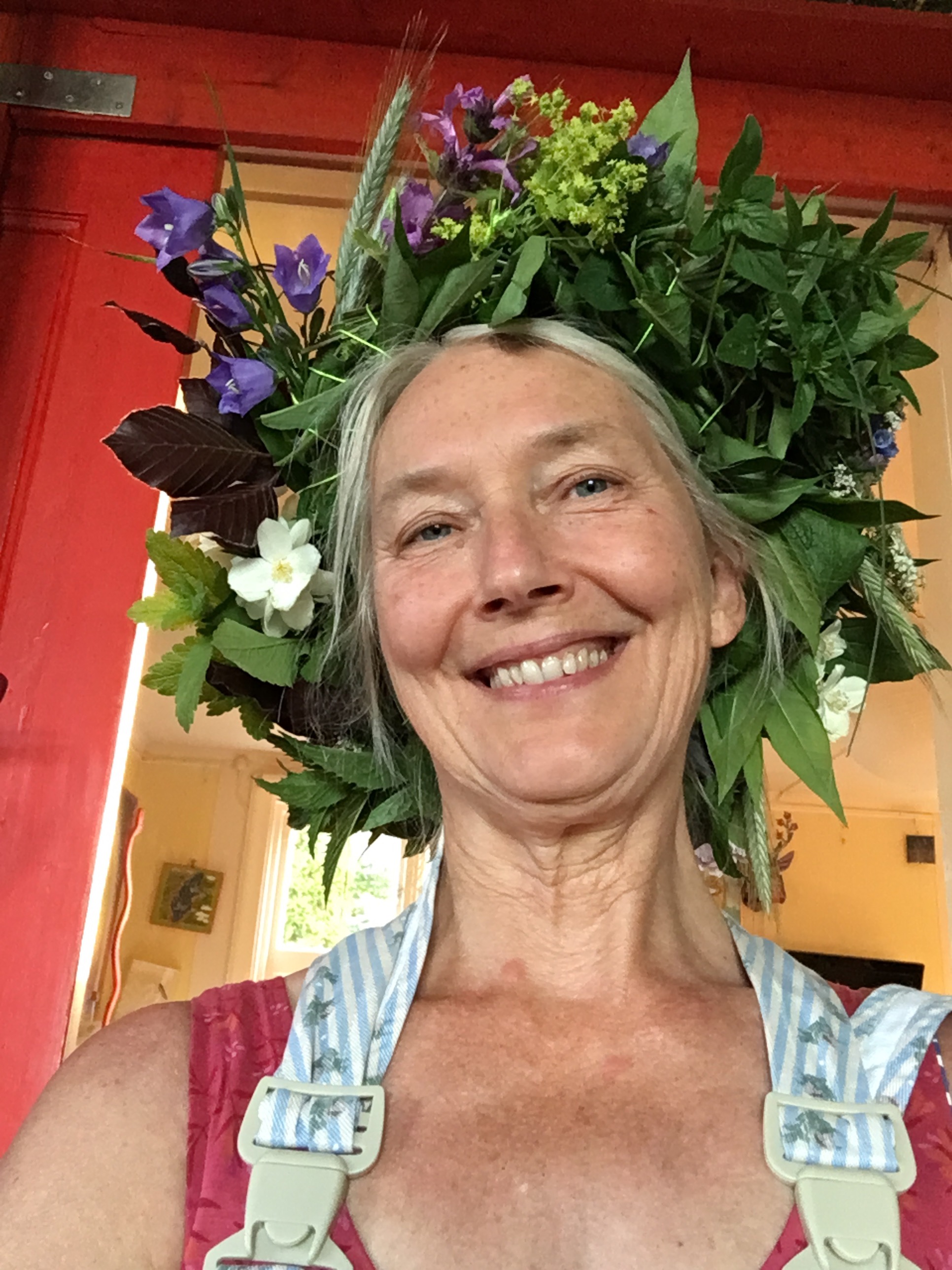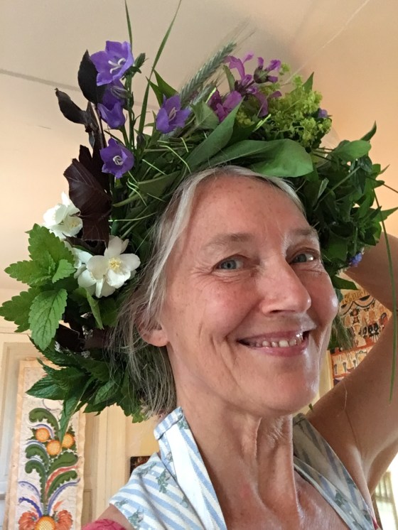 Så i år binder Ganga sig en krans, den ska sitta på huvudet -för det är inte bara urtjusigt -det är nyttigt o energigivande. Nu blir det största kransen! Här tar vi till alla knep vi kan för att få! Glad Midsommartid på er❤️