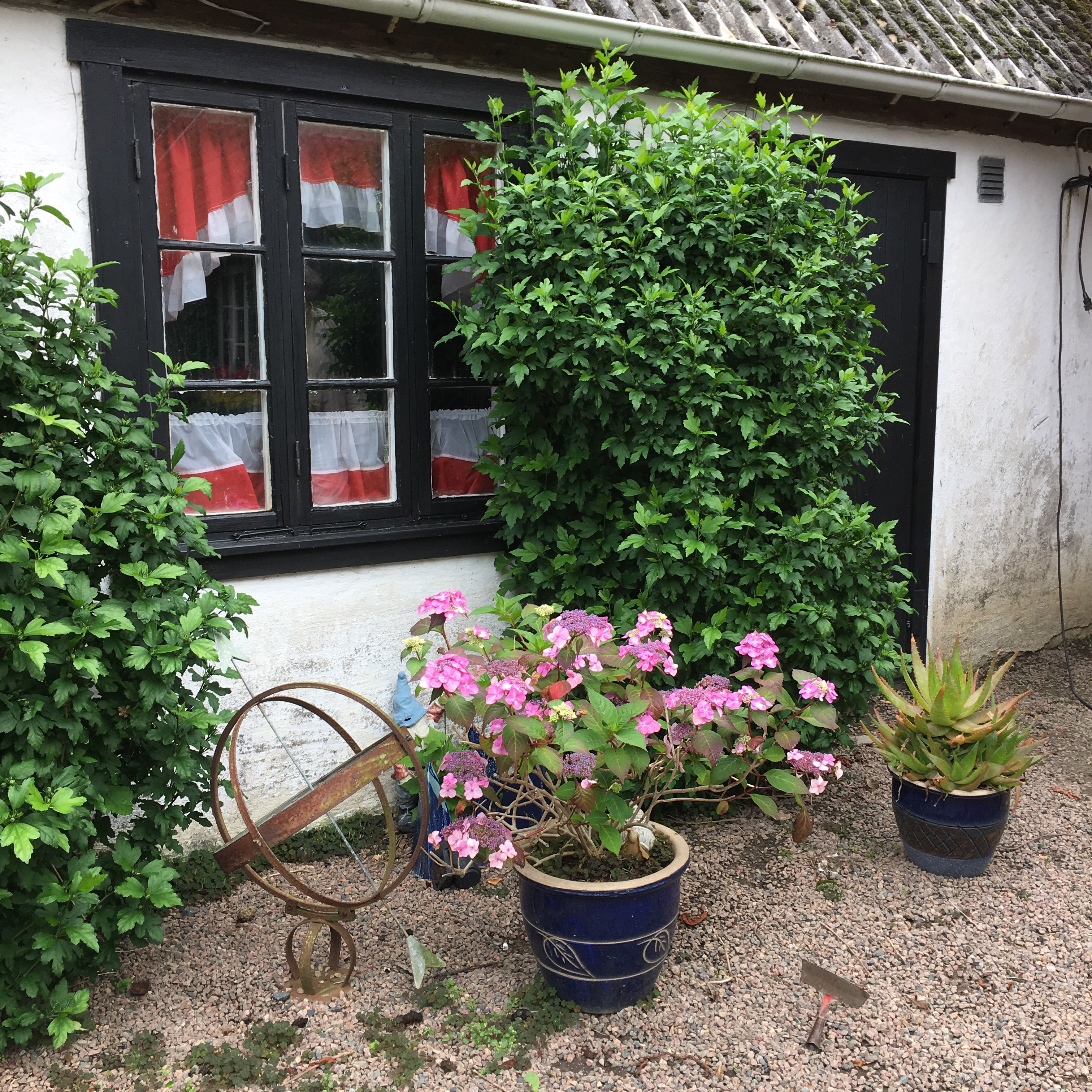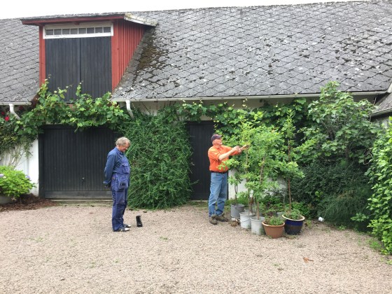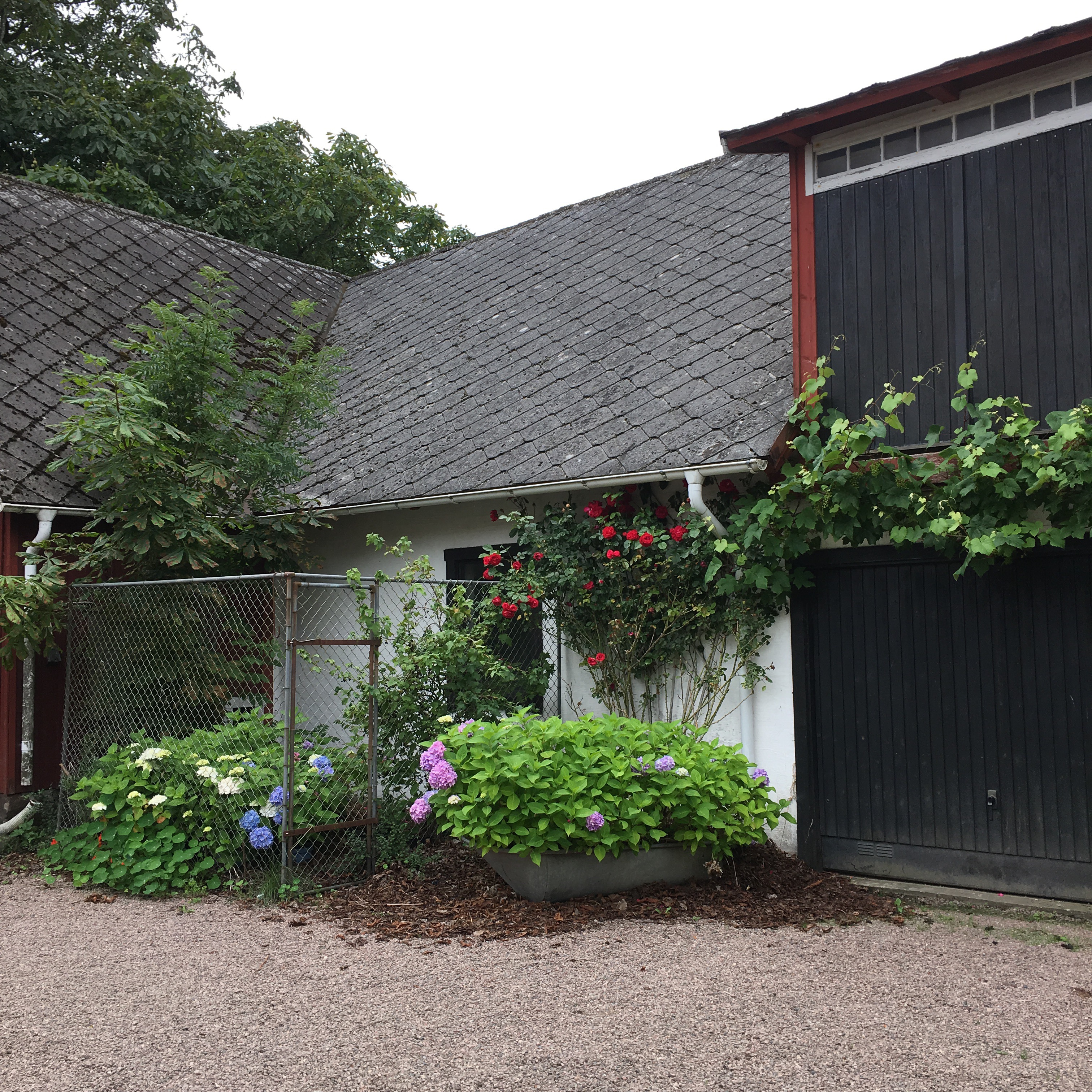 På innergården står krukor med trädprojekt. Gården lever och utvecklas, trots pensionnärsliv -eller tack vare.