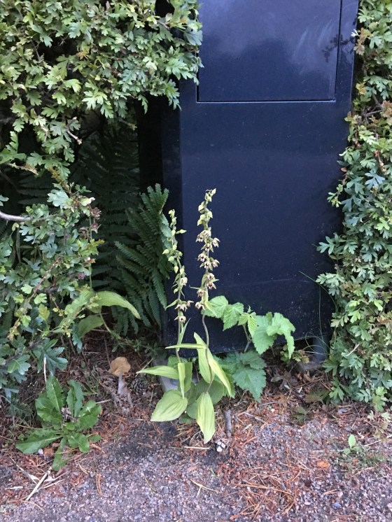 Vi kör iväg. Ute vid brevlådan vinkar orkidéerna på oss.  De heter Kal Knipprot, det märkliga är, att enligt faktaskrifter så är det sällsynta och växter på Omberg ( där vi, Ganga o Rurik bor) och så har de hittat hit, till sagohuset på Kullahalvön. Hur nu det gick till, men det är kanske en annan saga.