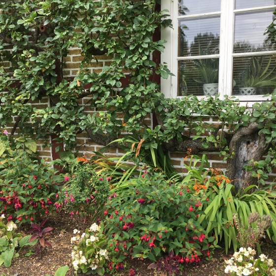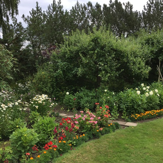 Trädgårdens grönska är tät. Dignande äppelträd o färgstinna rabatter.
