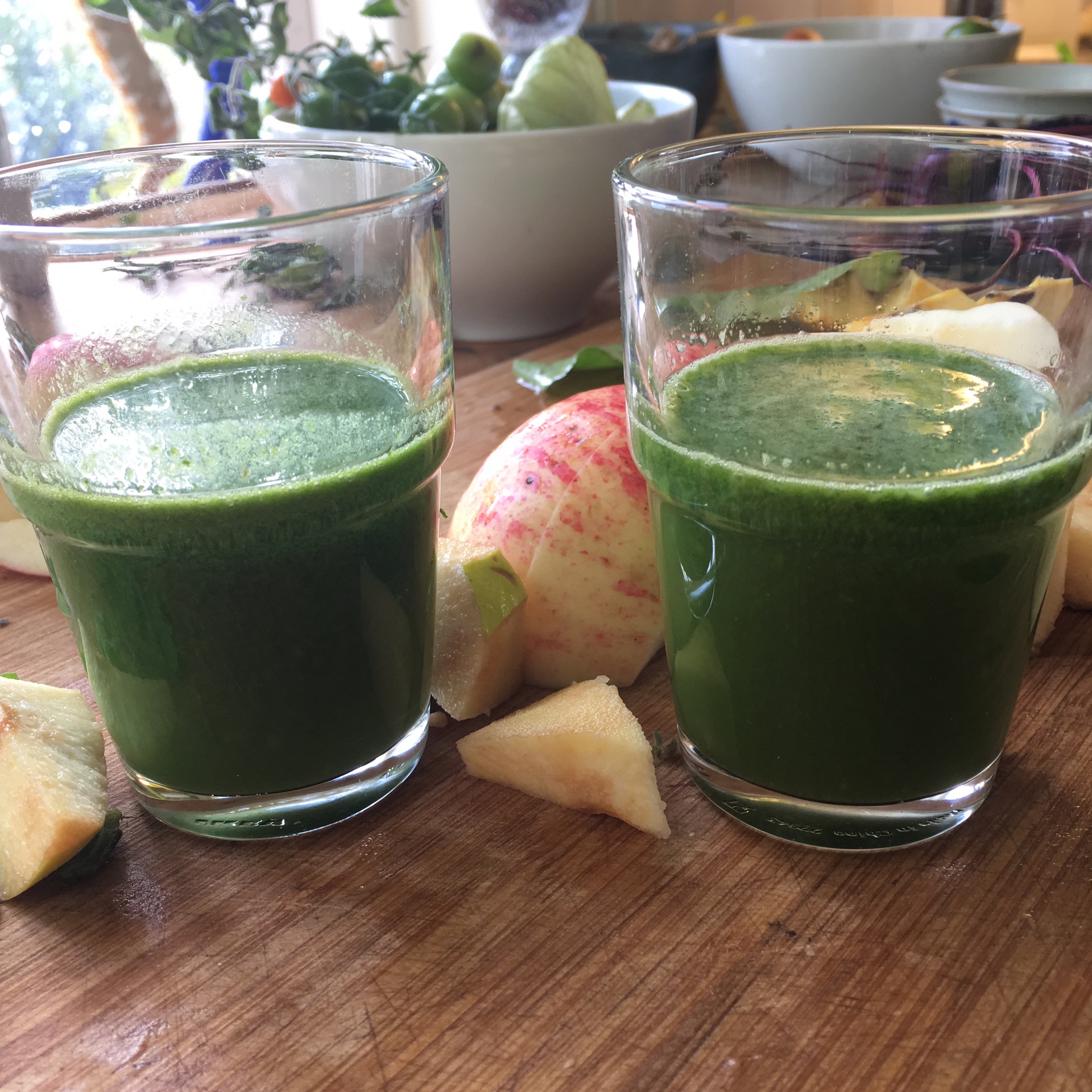 Så vi brukar välja ut det gröna först, plus typ äpple o päron eftersom de är ljusa i köttet. Lite vilt känns bra att ha med…. tistel, nässla . Sen kör vi på ( ja, vi överdriver) selleri, persilja, mynta, äpple….
