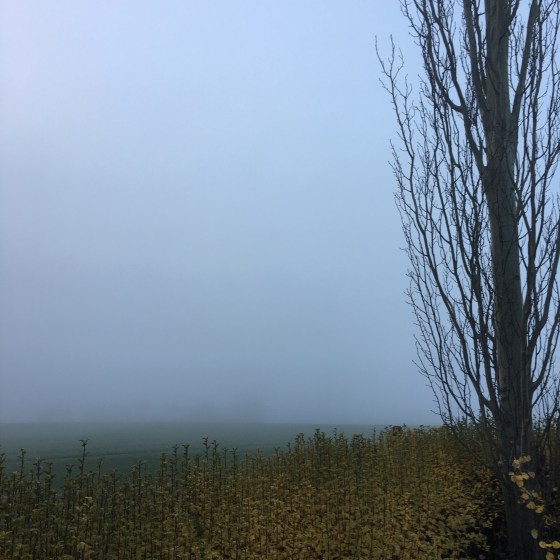 Jag kikar bort över Omberg och hinner se hur dimman rullar ut sig och Även Omberg sjunker in i Ommas täcke.