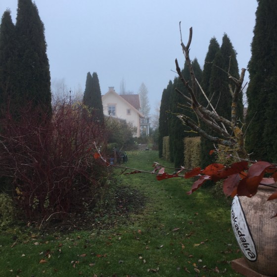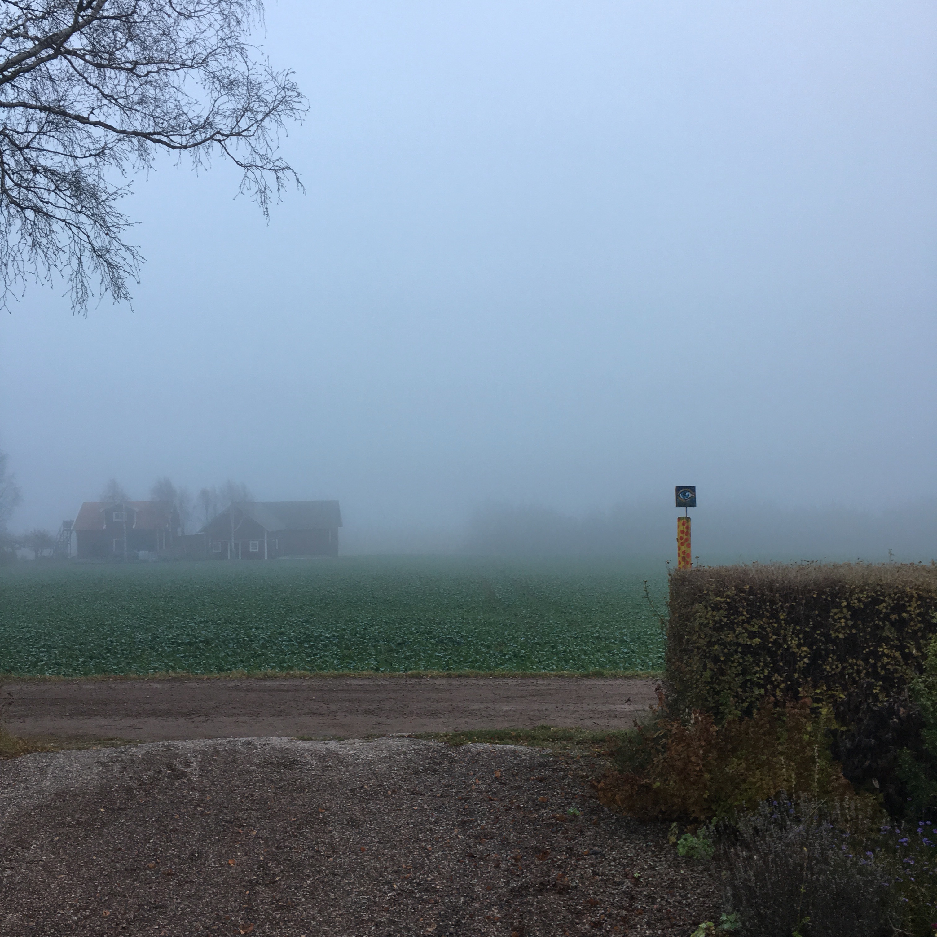 Jag kikar bort över Omberg och hinner se hur dimman rullar ut sig och Även Omberg sjunker in i Ommas täcke.
