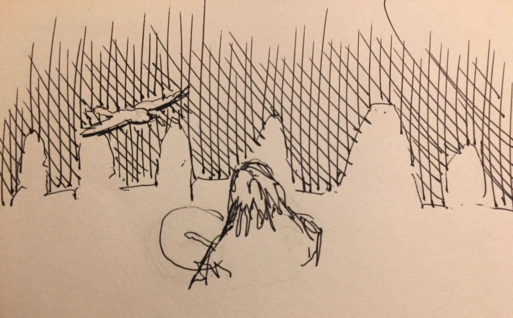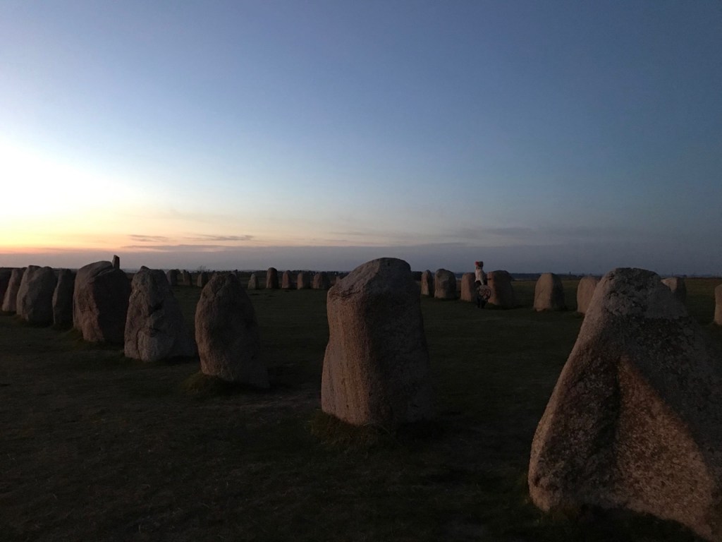 Ale stenar ligger på en höjd, nära havet. när vi kom upp på platån ropar några kråkor som en välkomnande signal, jag svarar.