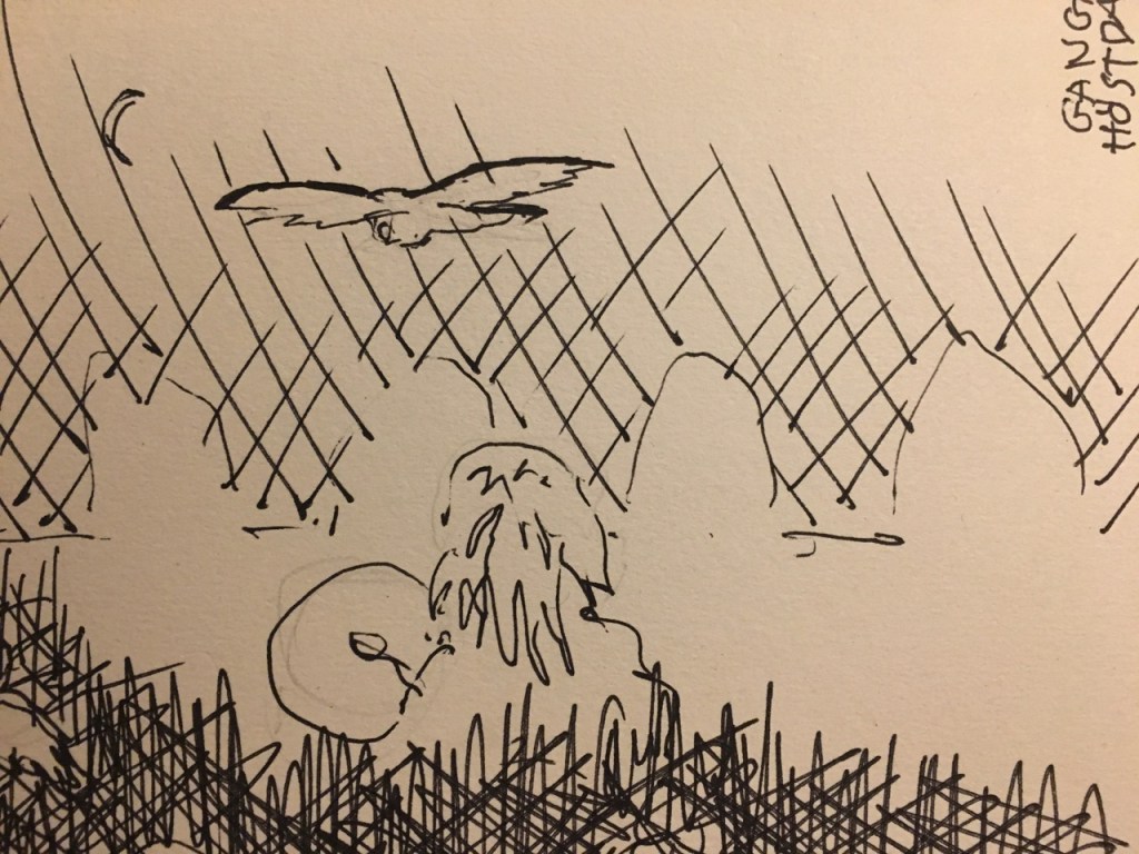 Det kom alltså en uggla rent fysiskt. Den flyger bort och kommer tillbaka, cirkulerar över Ganga ännu en gång och sätter sig sedan på en av stenarna.