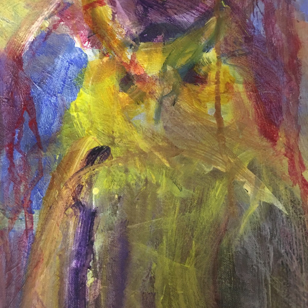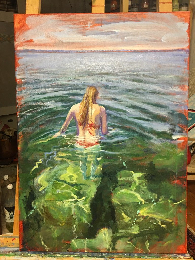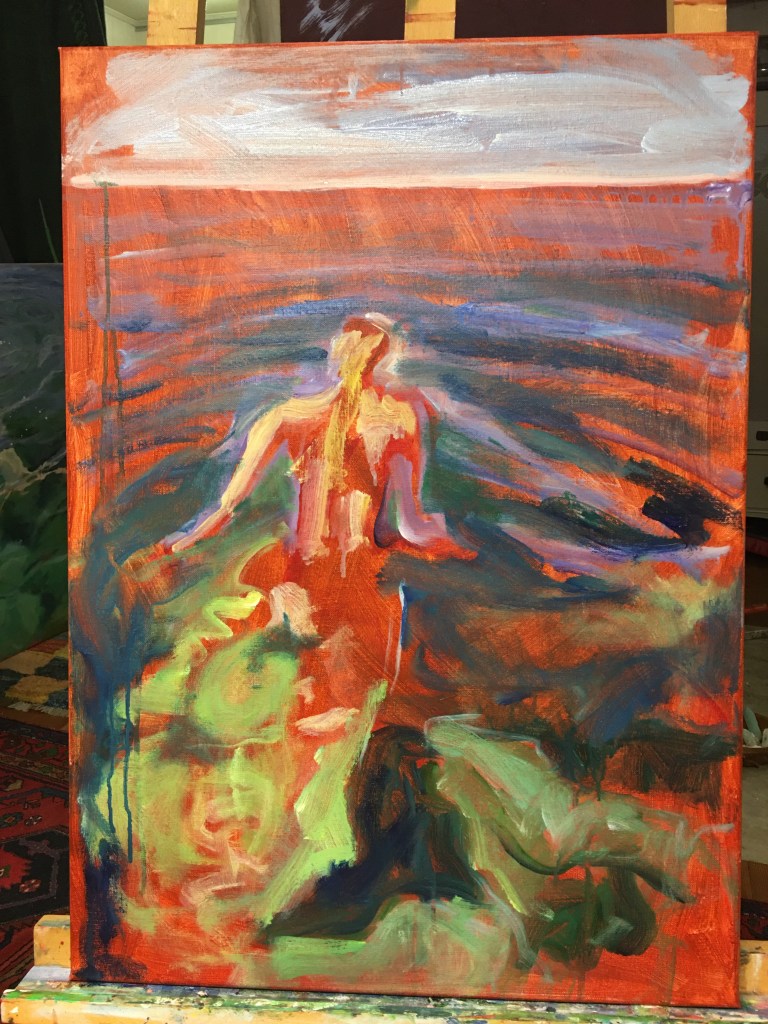 Tredje omgången, dags att lösa målarknutar. Det som inte gav sig enkelt. Vattenblänk runt kropp, nåt blänk på botten ovs. Nu får tavlan vila, några veckor. Ska sitta i soffan o titta, blandar felsökning med att njuta av det som blivit.