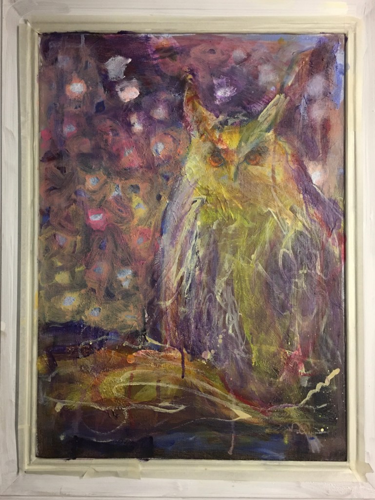 Ugglan blev målad på lite annat vis. Känt in, tagit in ugglan innan. Både visuellt och känslomässigt. Tittar på bilder och försökt känna den i kroppen. Sen e det bara att släppa och färger o linjer får lov att dansa. det som känns ”bra och spontant”.