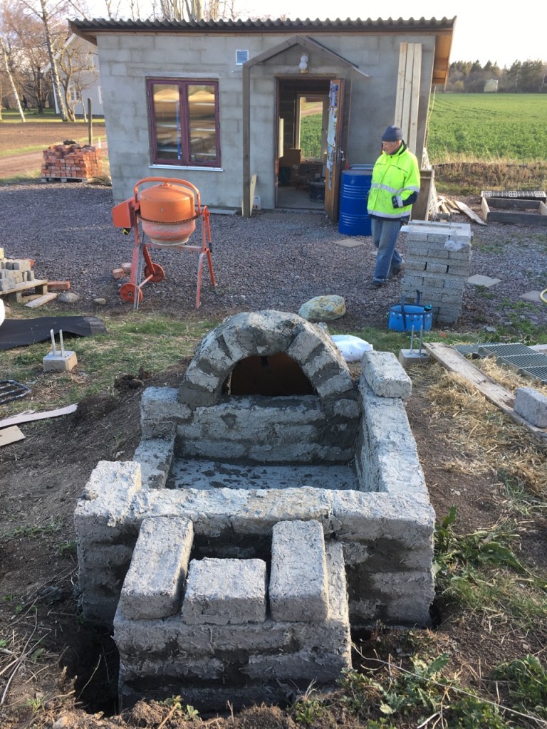 Nu har vi gjort en båge som stöttar själva valvet under murandet, vi hade lite bråttom i början så vi glömde att vi måste lägga ngn under bågen, för att få loss den, när den ska flyttas fram.