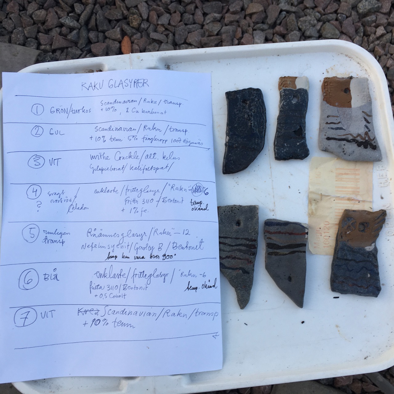 glad att vi hade gjort glasyrprover, där syns hur de olika glasyrerna inte och lite grann, har smält. Inte godkänt. vi måste bättra på vår kunskap, och vi har verkligen fått lära oss varför man i Japan pratar om en Raku-gud.