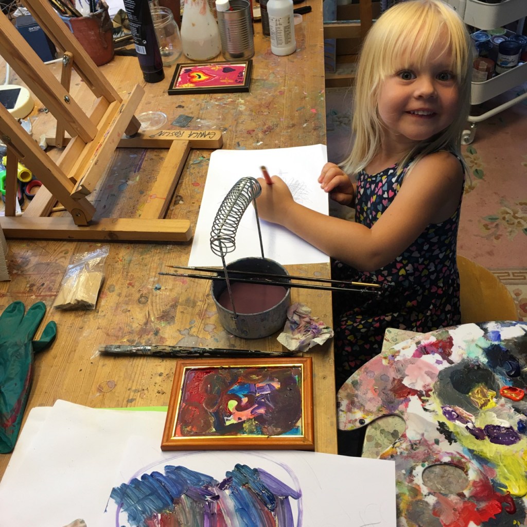 Mitt i sommaren fick vi förväntansfulla besökare. Gangas bror med familj kom på ett stopp under sin sommarresa. De två döttrarna: Elsa och Matilda såg fram emot att få besöka konstnärer! Vi kände oss som riktiga attraktioner. På önskelistan stod att få måla i ateljen. Klart vi ordnar med det!
