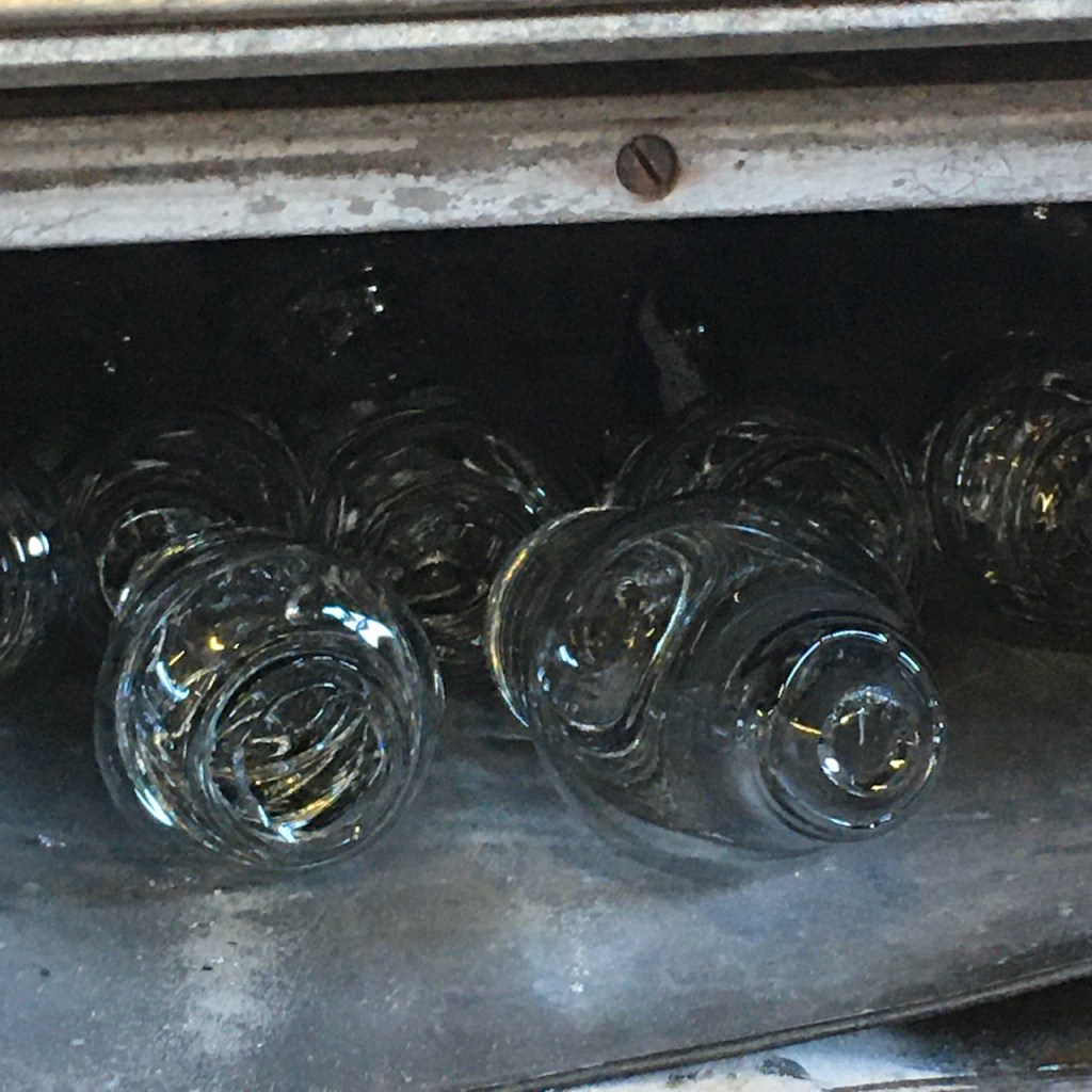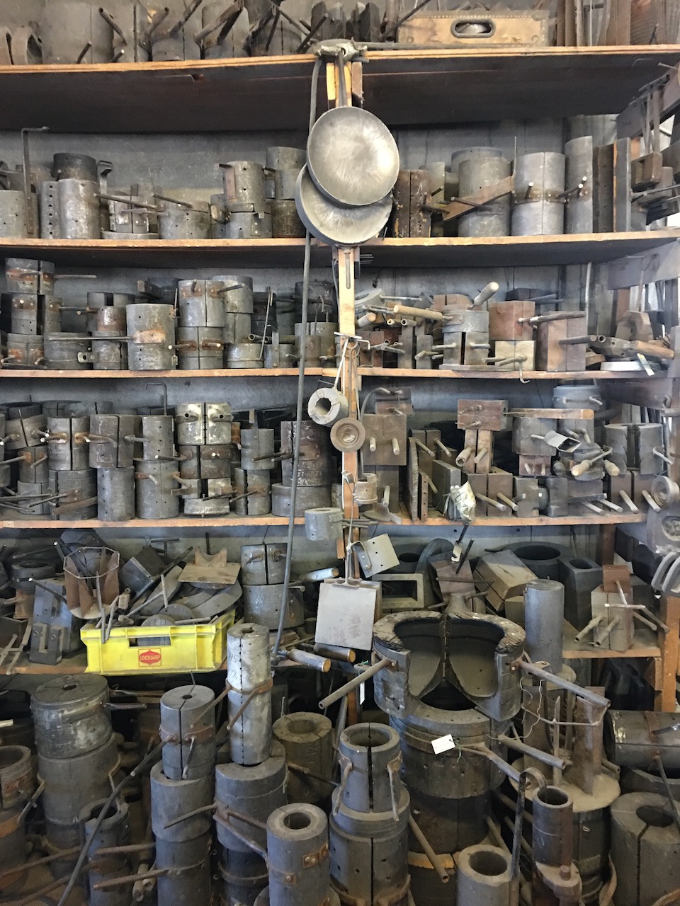 Ovan på bild ser du samlingen av glasformar -så många blir dom efter ett långt produktivt liv. Imponerande bara det. Glashyttan har som en själ -det är glasmassan, den heta lysande av sig själv, värmen därinne stänger man aldrig av. Det är alltid hett. Svalnar den, så blir det bara en stor klump, en ohanterlig sak.