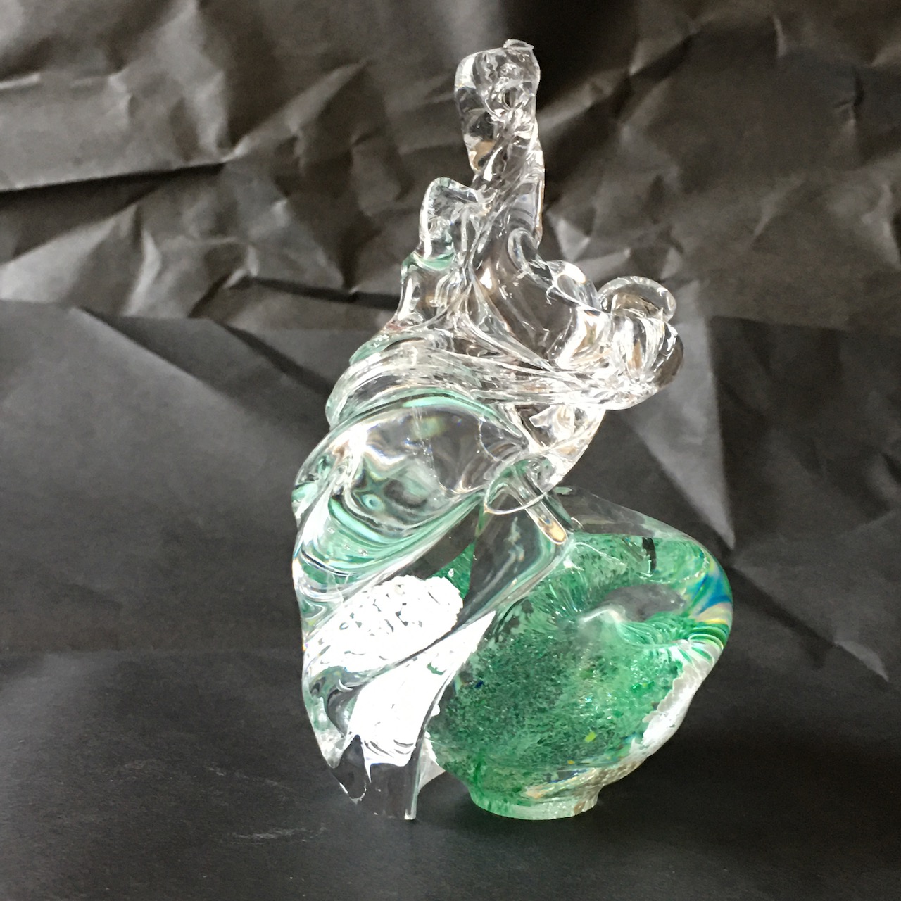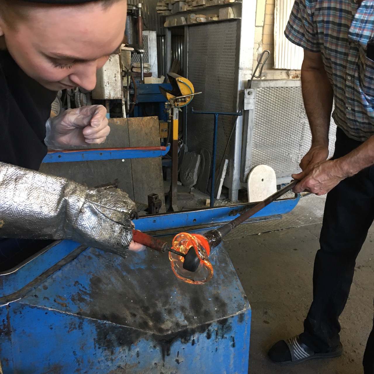 Sen fick vi prova allihopa, en i taget. Gert levererade den heta glasmassan och rullade stången medan vi koncentrerade oss på att svarva, med den blöta tidningen i handen -och det var minsann inte så bara! Glas är ett väldigt flörtigt material, en blir liksom fast, med en gång, hypnotiserad. På det sättet påminner det om raku. Det är väl hettan och glöden som gör det. Det är ju smält glas! Många hundra grader varm och självlysande. En måste vara fokuserad och marginalerna för att klanta till det, är inte så stora. Ingen tid att tänka på något annat.