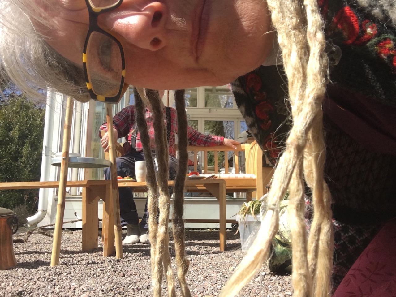 Ser bilden ovan förvirrad ut? Jo så är det nog, i alla fall hektisk. -Allt från uterummet har tagits ut. sorterats och städats. Vi har vädret med oss, sol och varmt, så soligt att Ganga knappt kunde ta en bild med mobilen, hon nästan kryper in i bilden för att se skärmen, på bekostnad av motivet, hm.