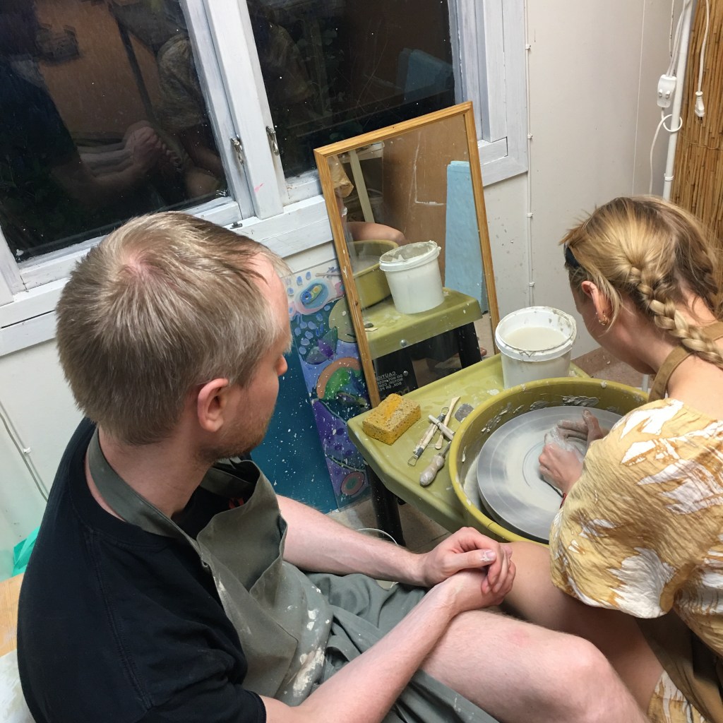 …och Marcus erbjöd sig vara ler-slav ett tag. Vi silar den lokala leran innan vi använder den, tack för avlösning vid Lersleven. ( Marcus drejade också, så han var inte bara slav )