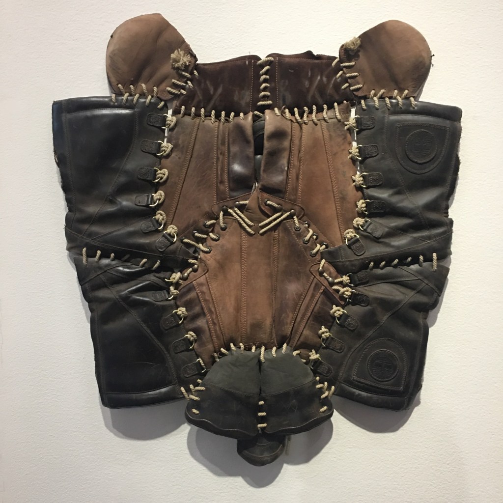 Spännande återbruk med snöpinnar: ”snöpinne-DNA” och ( kanske) ett livstycke, eller en Sköld i gamla kängor.
