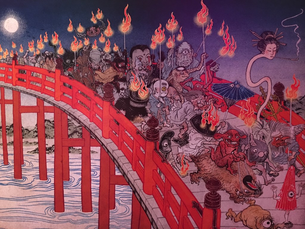 Här vandrar de hundra demonerna genom den Japanska natten. Redan på 900talet hade man en seriös Spådoms byrå, som gick ut och tex varnade för när det var risk för att det skulle bli en natt med de 100 demonerna ute på gatorna, då rekommenderades utegångsförbud. Det här var allvar.
