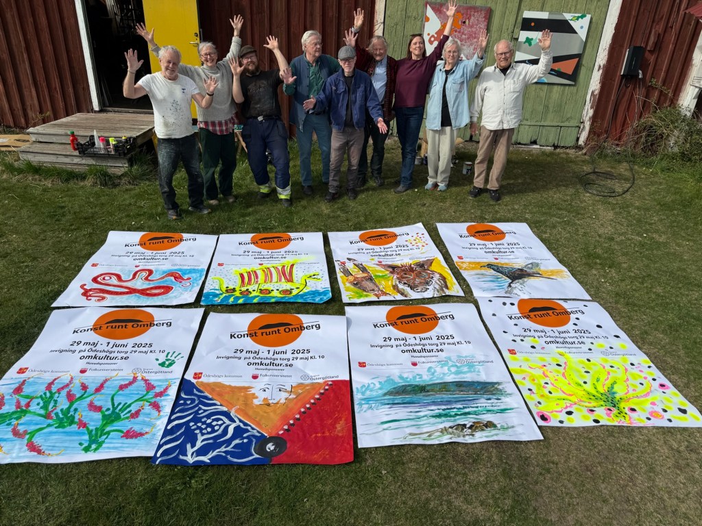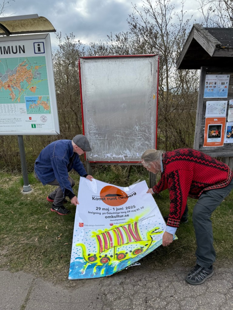 Morgan Johansson och Rurik sätter upp en stor affisch på Hästholmens kommunala anslagstavla. Nu närmar det sig Konst Runt Omberg! Just den här affischen har Rurik målat, ett Vikingaskepp.
