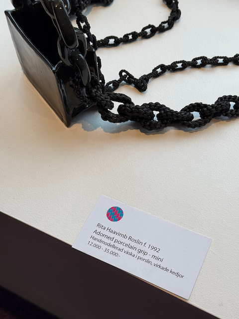 Vi är alla Rita-fan och lite besvikna på placeringen av hennes porslinsväskor. De ÄR verkligen både fina o vackra, men en upphöjning i form av podie, hade ju trots allt taggat upp det. men så är det ju, när nån annan curerar, inte alltid att man själv håller med. De ser helheten och en annan ser det speciella verket.