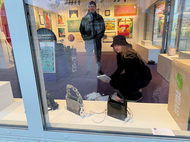 Ganga är i Stockholm över dagen. Möter upp med Rita, som är med och ställer ut på Husby salongen. Hennes Marcus är också här, liksom Siri o Jonas. Kul familjehäng. Nu ska vi se hela salongen, den är uppdelad på flera platser. Men viktigast först: Ritas verk! Var finns de, filmen nedan visar hela den utställningsdel som Rita var med i. Ett Pop-Up galleri. Ser ni de fina svarta väskorna !