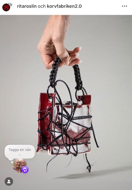 väskorna här, är i porslin. så fina. De är hennes egen tillverkning ( i Östergötland, säger inte mer 🙂 och remmar är även de handens (Ritas) arbete. Både Ganga och Rurik är så spända att nu äntligen få se helheten -hela kollektionen. Det som visas här är lite detaljer. Men så är det, varje detalj har fått total uppmärksamhet och bildar en helhet. Nu ska den visas. Visningen är endast en kväll, en visning. För den som vill och kan, här är länk till biljettköp.