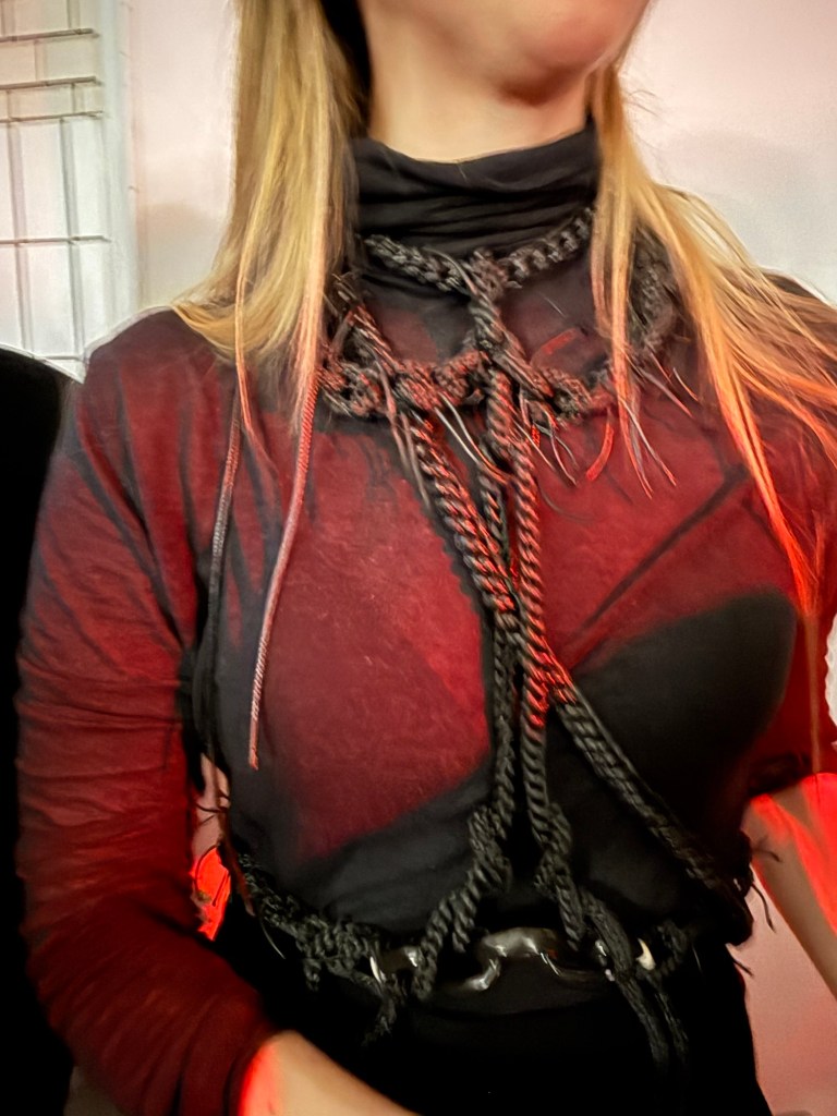 Många av modellerna hade bindningar runt huvudet och de röda sömmarnas snörning lyser i rött. Som blod. Vackert o intensivt.