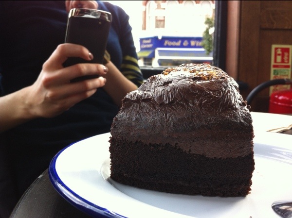 Och HUR går det till att klämma ner en monsterstor chokladtårtbit på det?