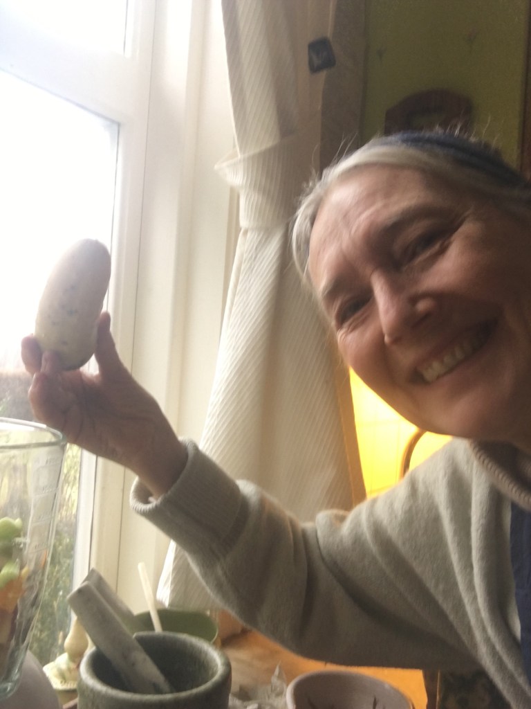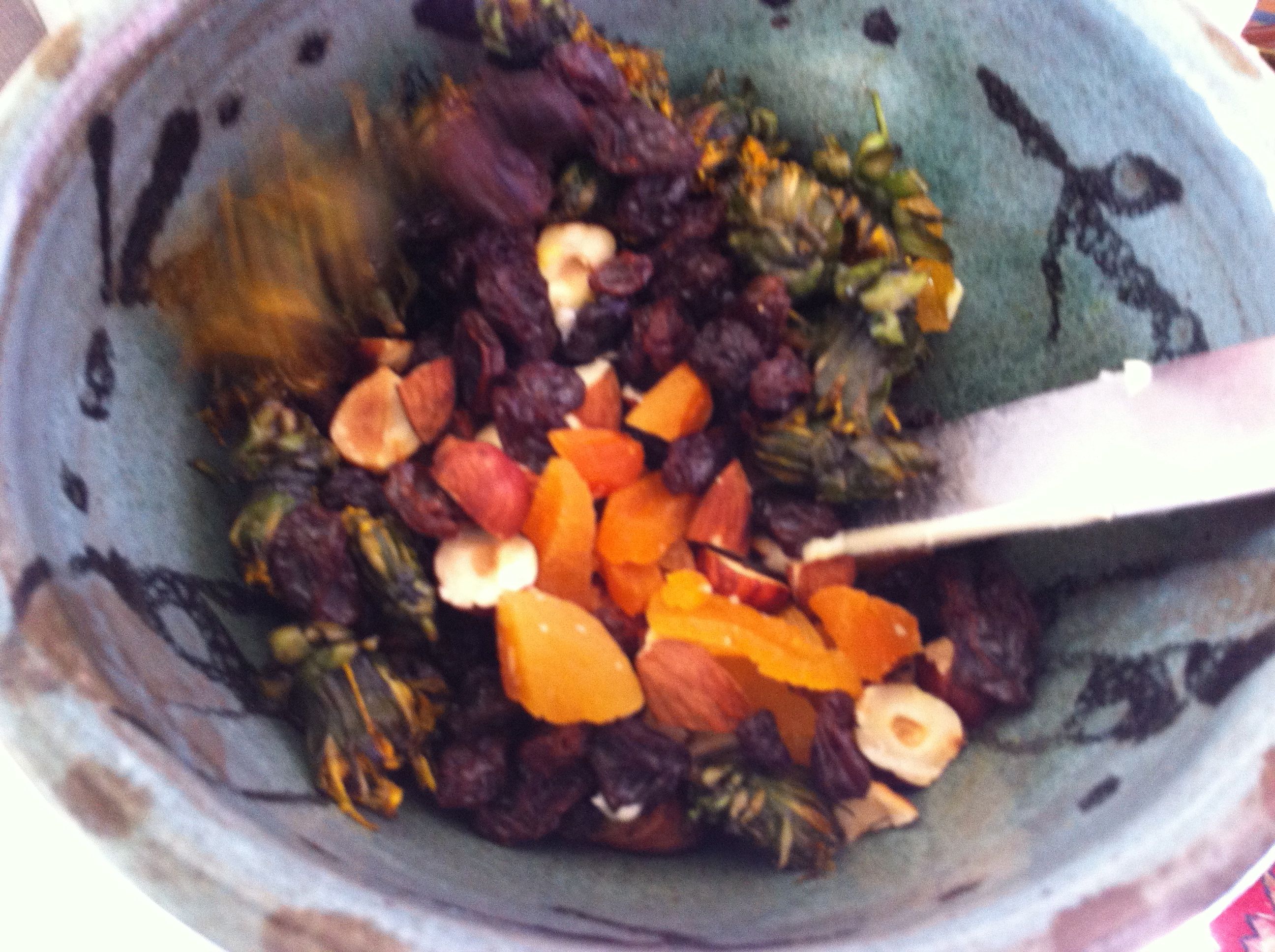 Men innan dess har det varit hacka-frukt-kalas. Frukt, nötter och maskrosor(!) just idag firade vi försommaren med alla maskrosorna (förstekta i olja, curry och salt). Alla ingredienser måste vara framme och klara, för när man väl sätter igång, så är tidsmarginalerna små!