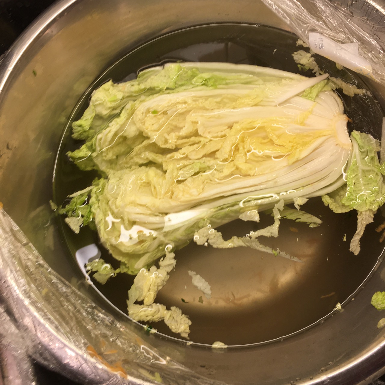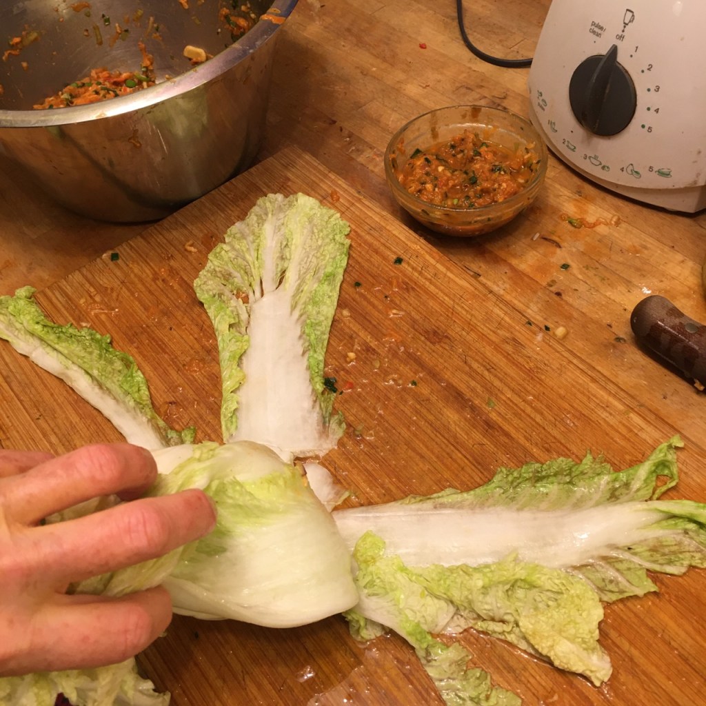 Salladskål är frasiga saker. Men efter att ha fått strött lite salt (utan jod) mellan alla bladen och sen lägga i salt bad – så är den mjuk och följsam. Kålen är delad i två delar inför saltbehandlingen. Ganga sköljer av den noga så saltet mildras, dagen efter då det är dags för inkryddning.