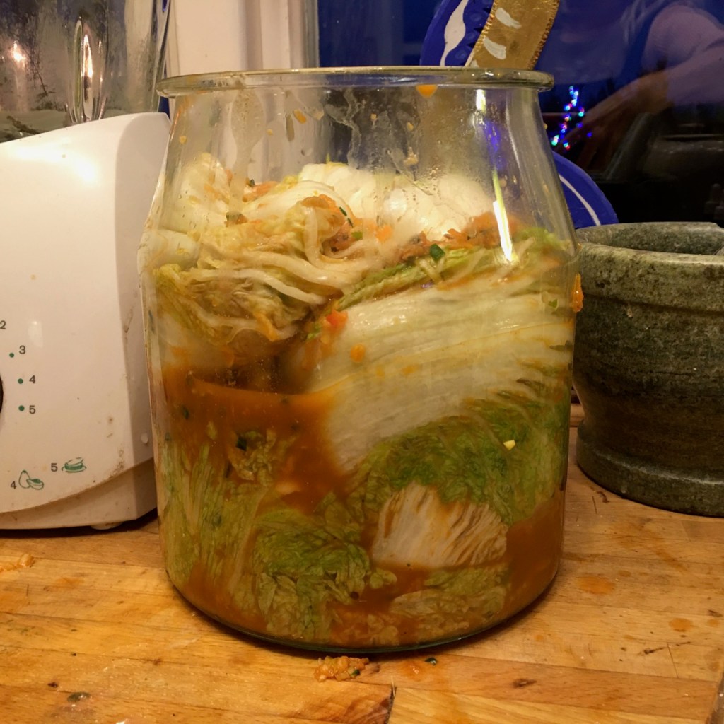 Vi har ett knep till, och det kom vi ihåg, det är att tillsätta extra bakterier i form av Probioform. Så när Ganga gjorde kryddblandningen, så följdes receptet -och sen la vi till 0,5dl probioform. Det försäkrar liksom att rätt bakterier är på plats och det gör också att man kan använda den kål man hittar. Det behöver inte vara eko och obesprutat, processen kommer igång i alla fall. Dessutom är bakterierna i den här processen, i alla fall om probioform är tillsatt, så effektiva, att de äter upp alla ev rester från besprutning. Det lär ta tio dagar räknat från start av fermenteringen, så är den fri från besprutningsresten. Bakterierna äter upp och omvandlar dom. Det gör bra mat, som ju kimchi är, till ännu bättre mat! Vill du köpa egen probioform, kan du göra här.