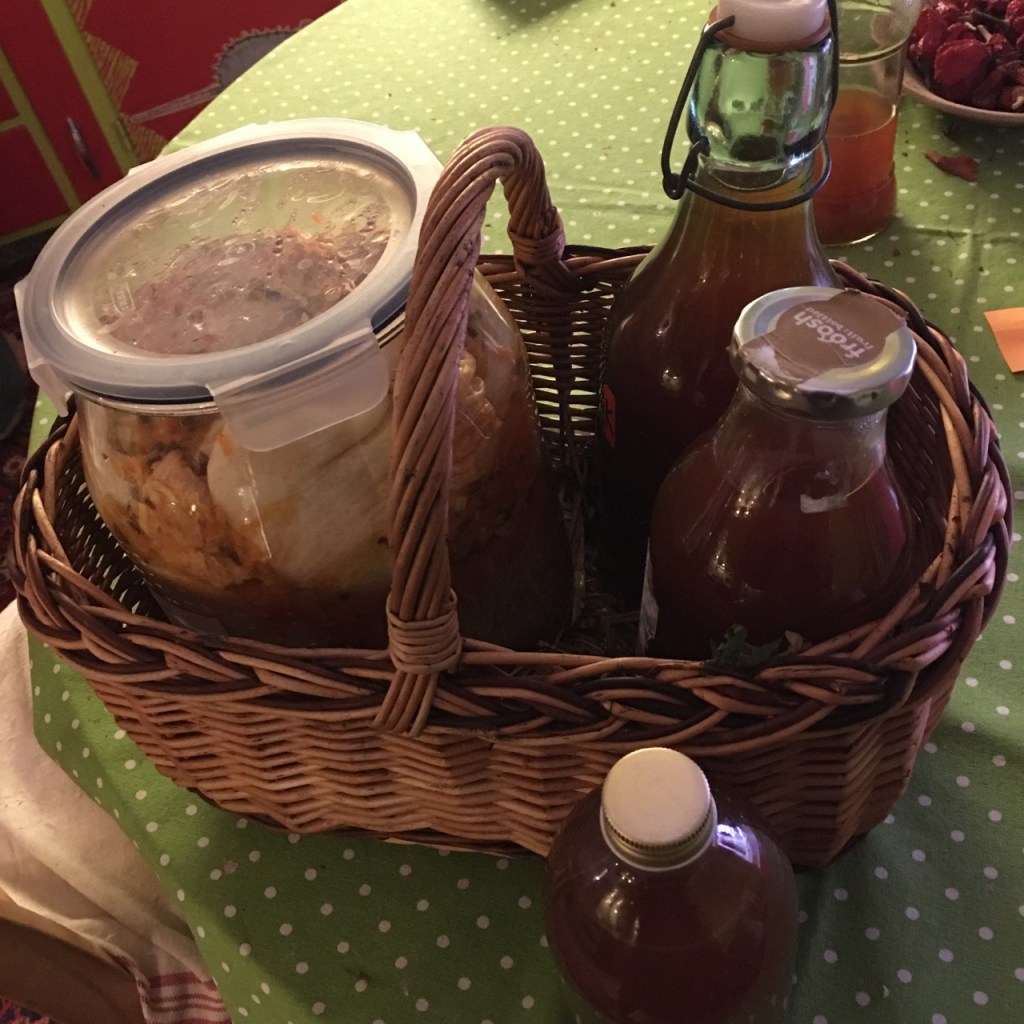 Nu packar vi korgen med godsaker för framtiden. Det är förutom kimchikrukan, flaskor med kombucha, som vi lärt. Nå får de vila i vår potatiskällare, tills det är dags. Rikedom