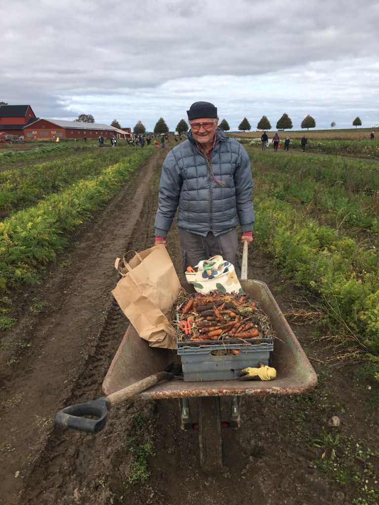 Vi blir lite till oss, så efter löken glömde vi att fotografera! Men vi fyller skottkärran med lite av varje: majs är najs. Några minipumpor , palsternacka och selleri och mycket mer. vänligheten mellan alla människor är påtaglig och vi åker hem, med både goda grönsaker,gott humör och med massa friskluft.