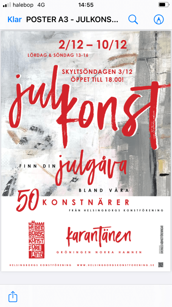 Nu vet vi att den 4 januari 16.30 -17.30 blir det samtal runt och om vår konst på Biblioteket, vi är där. Det är Bibliotikarien och kulturarbetaren Camilla Akraka som håller i samtalet.