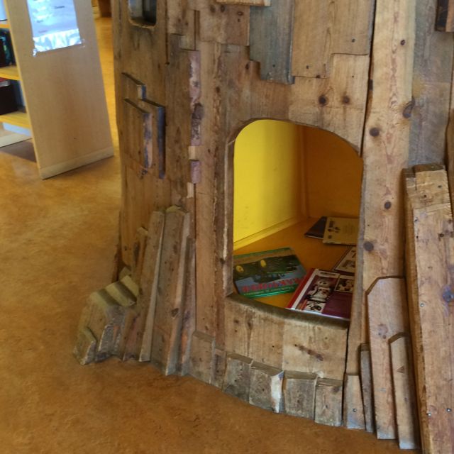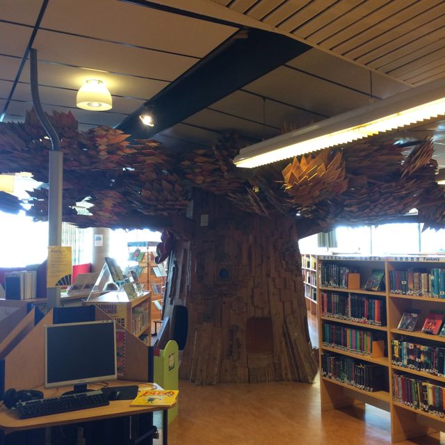 Då hamnar man väldigt snabbt på Stadsbiblioteket. Egentligen är det ju bara att gå in o säga ”hej kan vi lämna några broschyrer om Konstrundan?” Men Här är ju så fiiiint!! Vi bara måste gå in o gå ett varv runt det stora TRÄDET.