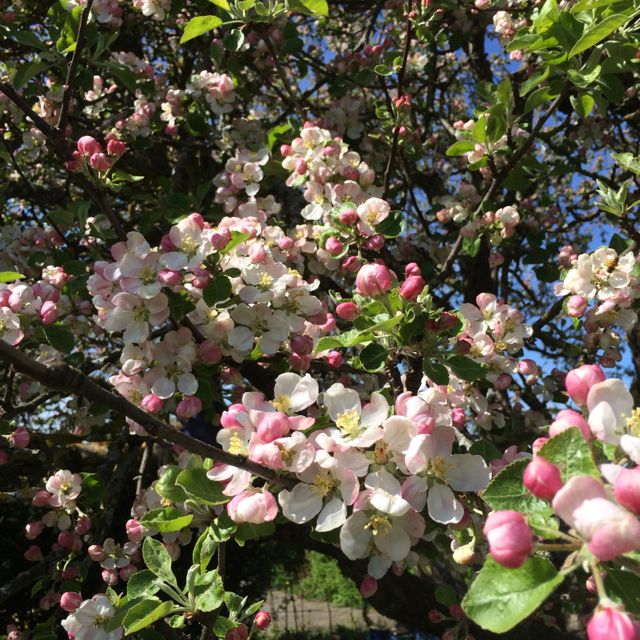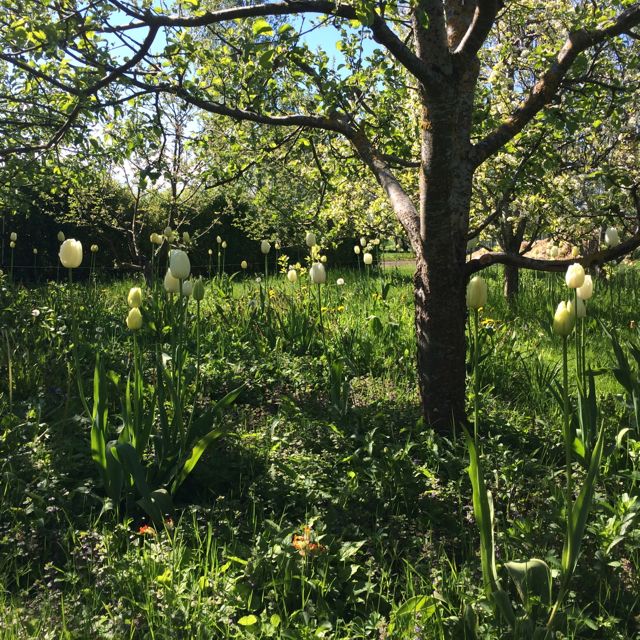 Men äppelträdet sjunger!! Det är ett gigantiskt, gammalt fint träd, nu vibrerar det av alla insekter som dansar lyckligt runt blommorna. Det är fantastiskt. Både när man lyssnar till det eller tittar på det.