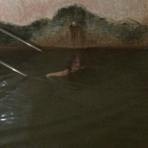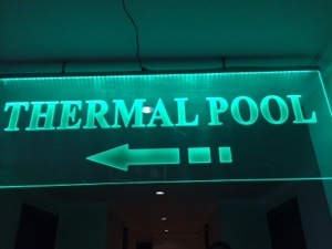 Så härligt varmt o skönt! Vattnet har en rödgrummlig färg, fyllt med mineraler. Egentligen vill jag inte alls gå upp!