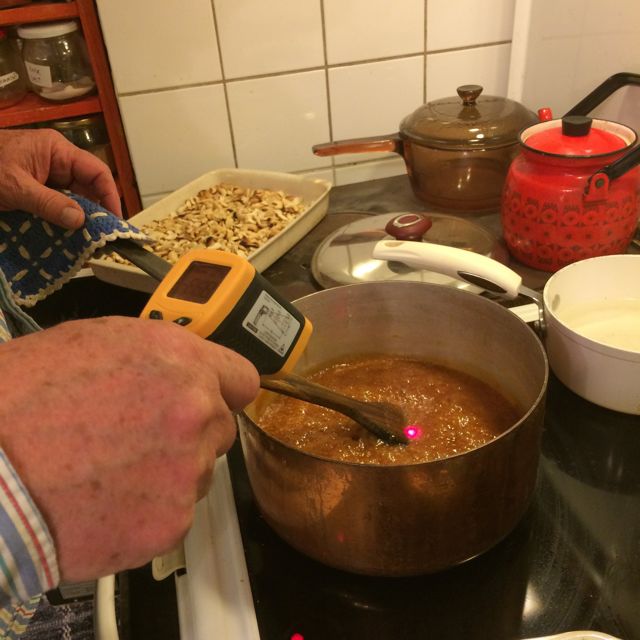 ”Det gäller att vara noggrann!” smeten ska kokas tills den når 120 grader. Laser pricken mäter smeten, på tiondelen.