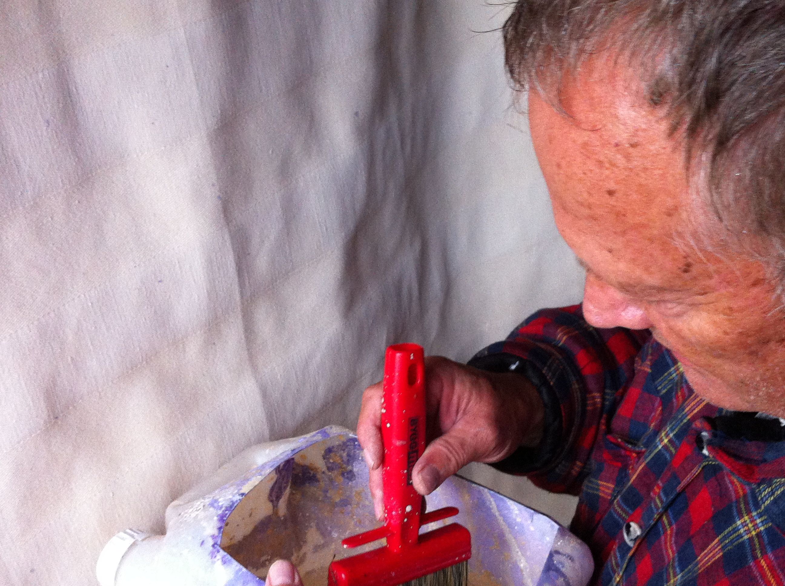 Rurik doppar penseln i byttan. Det här har han gjort många gånger!! Det var under sin tid som smålandsbo som Rurik lärde sig bonadsmåleriet. Det har blivit många bonader sen dess. Nu för tiden improviserar han mer i målandet, som nu, när vi målar inför utställningen till Naturum. Det blir speciella Tåkernbonader och annat bus.