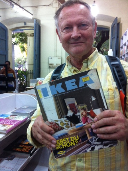Vi går en sväng i bokhandels också. Letar en bok till Rurik. Vad sägs om en IKEAkatalog på tyska för 170 rupies? Jag håller på våra handdukar det är mer prisvärt.