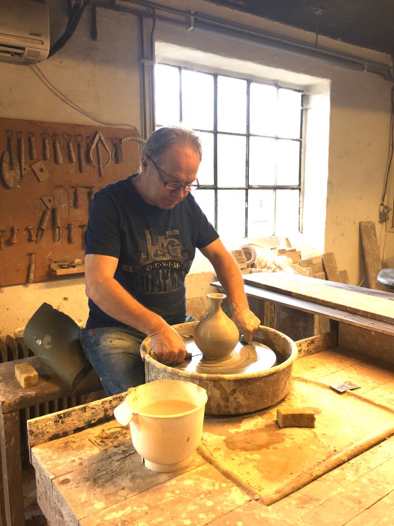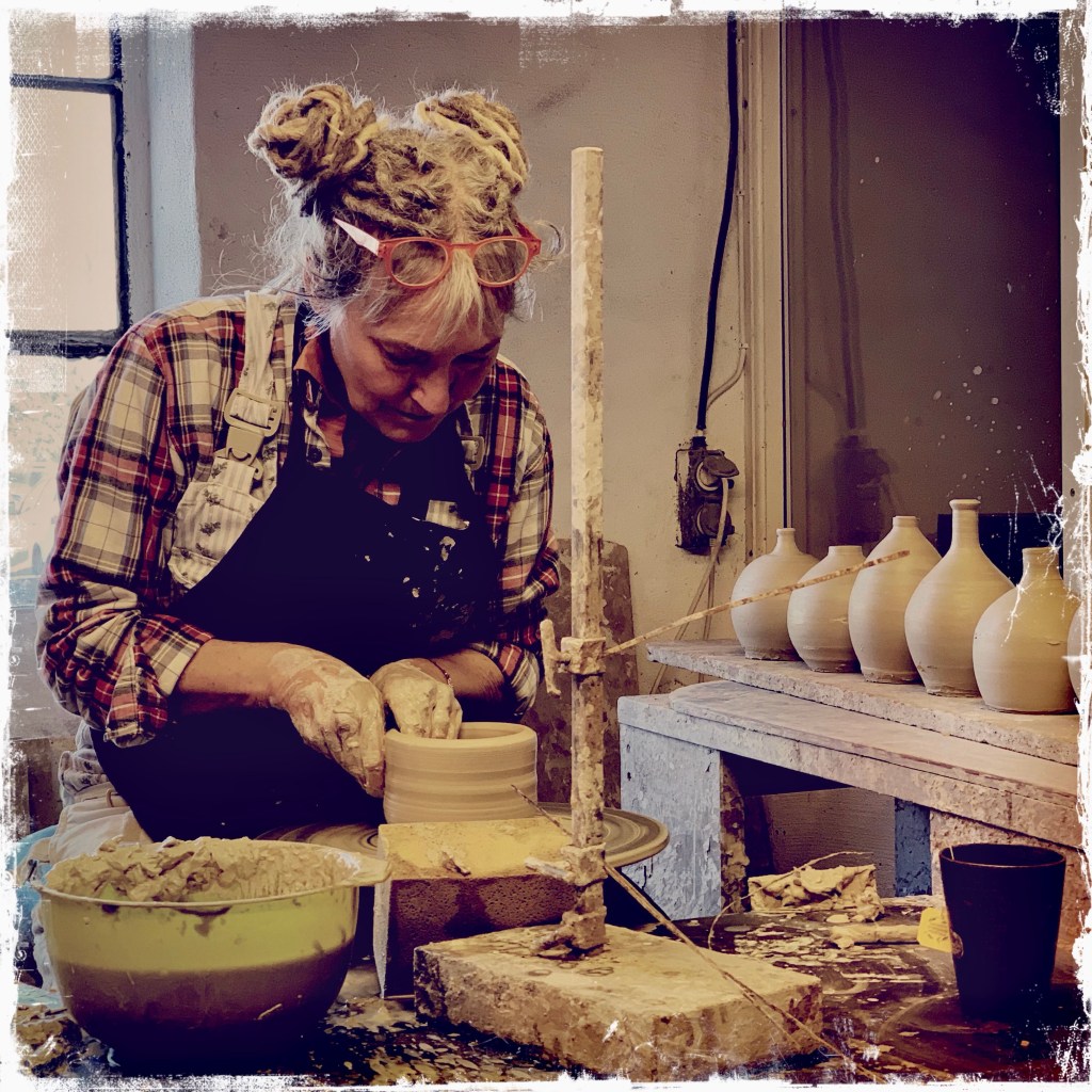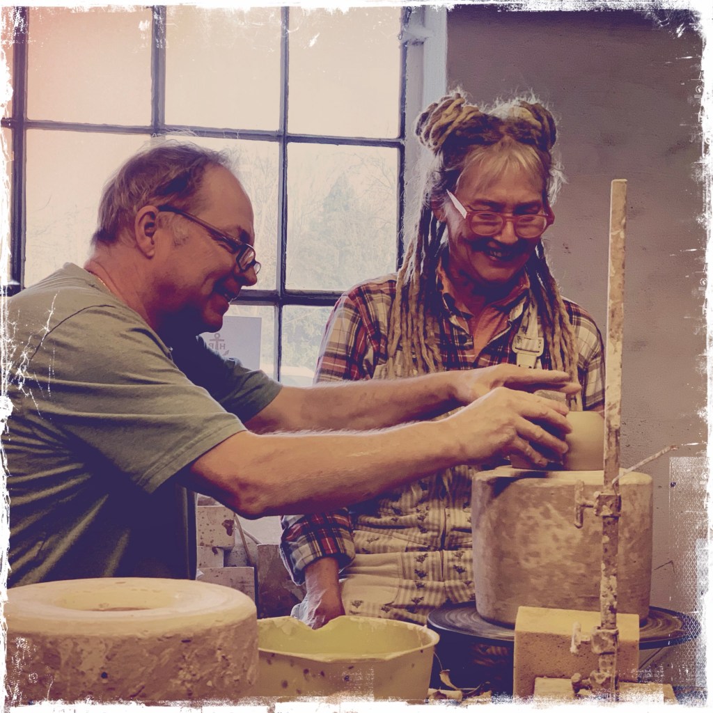 Vi är på Höganäs Saltglaserat, Anders Johansson är mäster och vi drillas i drejningens konst. Ovärderlig hjälp! Vi har njutit och drejat oavbrutet till utmattningens brant.